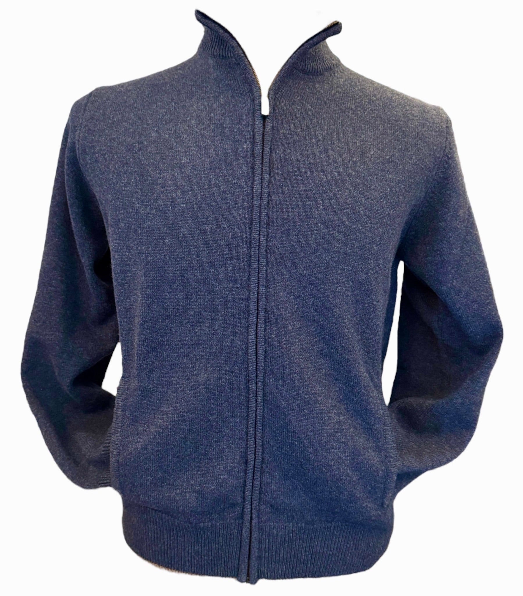 100% cashmere sweater jacket crafted by Adesi from Biella Italy. The finest knitwear in a classic full zip bomber style jacket with side pockets. Beautiful indigo blue with contrast taupe color inside the collar, and tipped on the cuff and hemline add interest. An incredible luxe texture that is so soft and warm, you won't want to take it off!