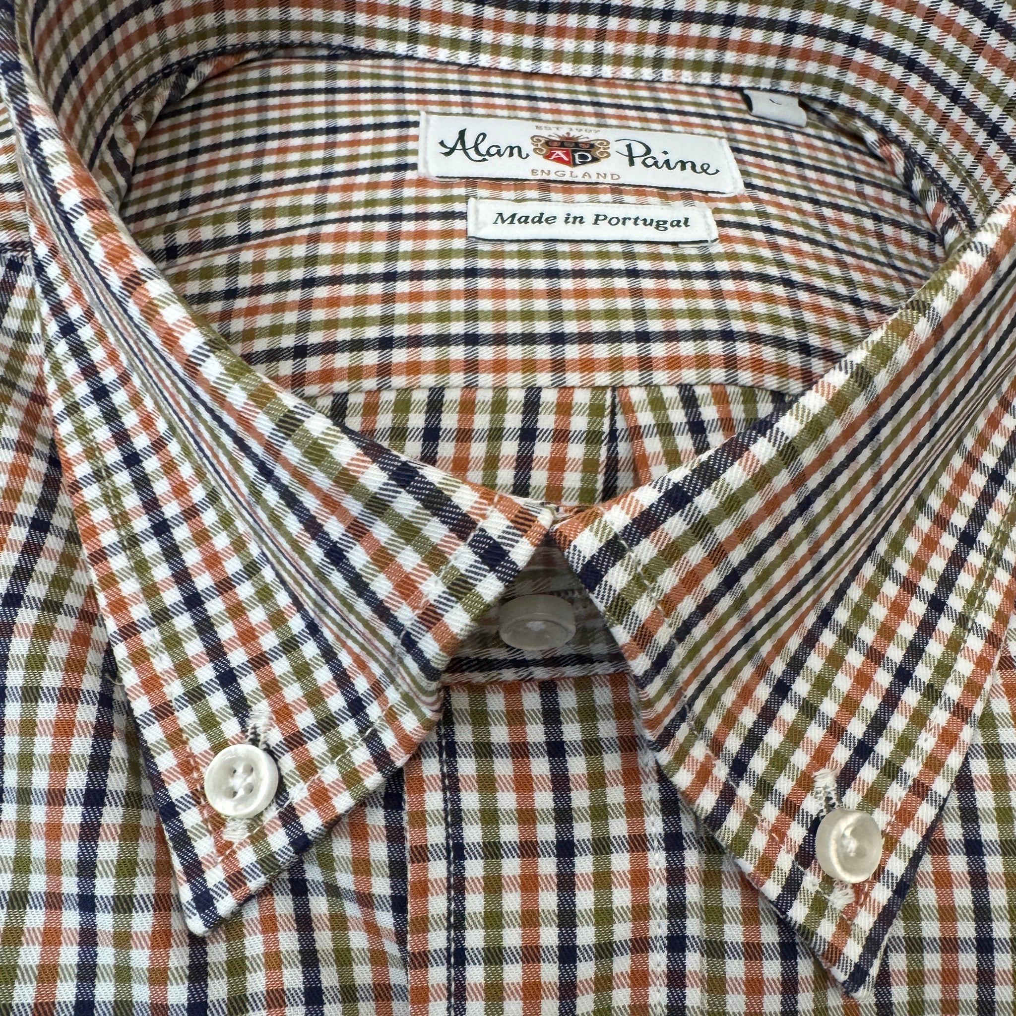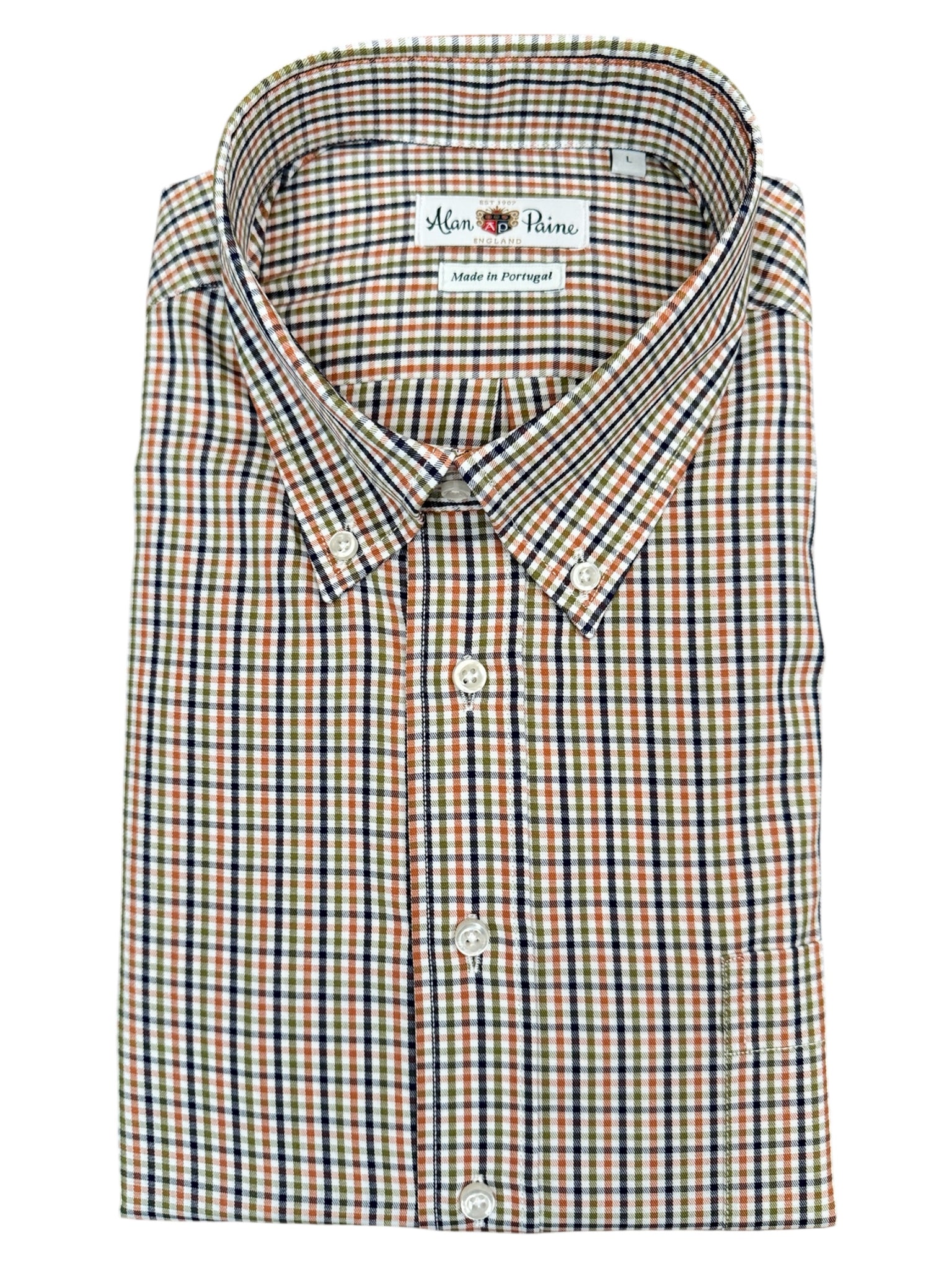 A classic button down shirt in a cotton check pattern. Stripes of navy, orange and olive that intersect into a great check pattern on a white background.