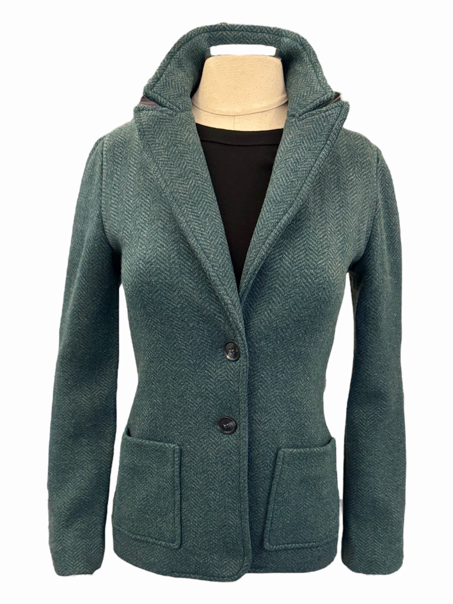 Knit blazer jacket with soft herringbone pattern in a wool blend. charcoal herringbone pattern on a green malachite background that creates a textured yet soft look. Typical Amina Rubinacci body hugging fit that shapes you in the best way.