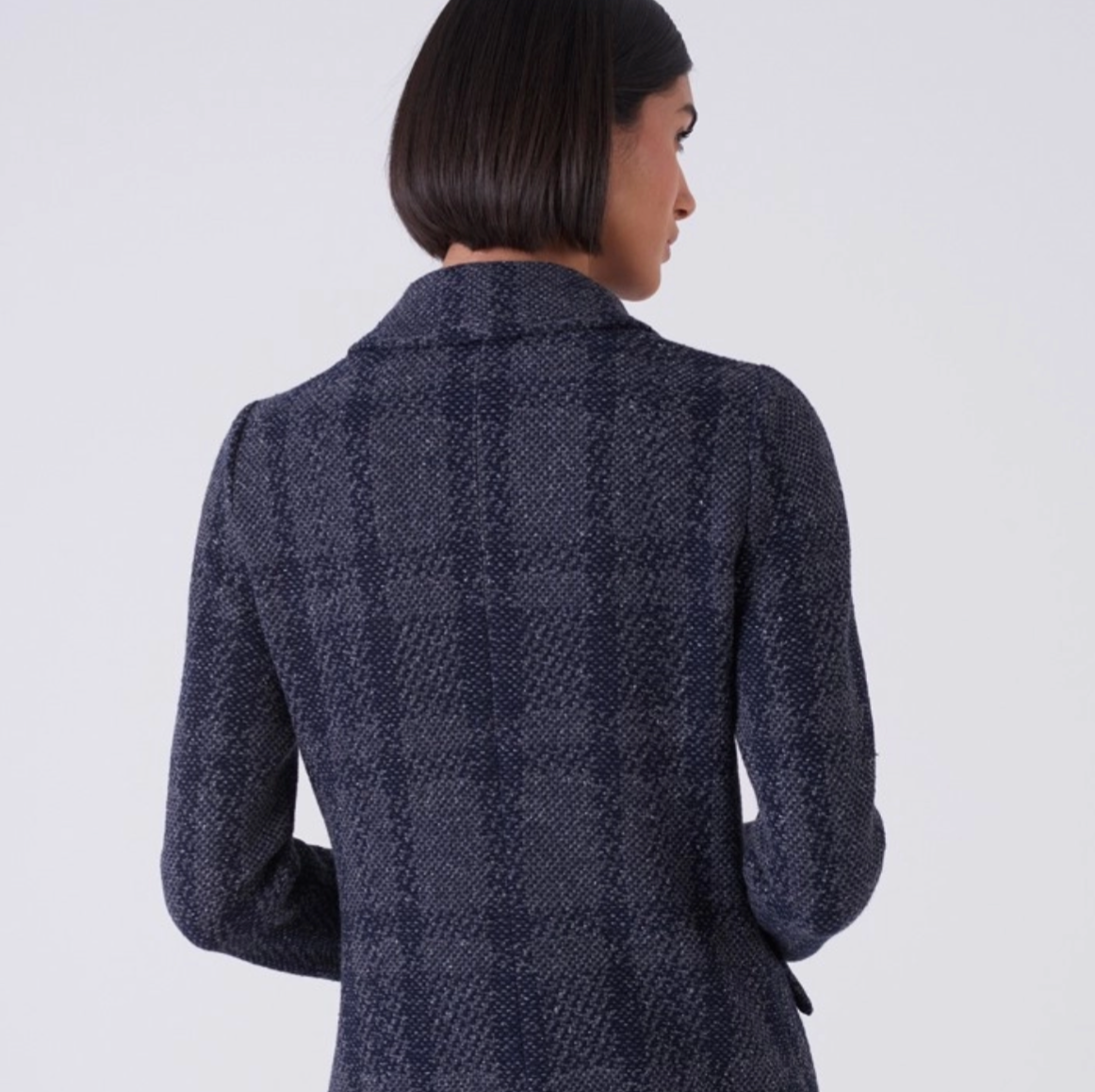 Long jacket with soft check pattern in a wool cashmere blend. Deep forest green with a wide navy windowpane design that creates a textured yet soft look. Typical Amina Rubinacci body hugging fit that shapes you in the best way.