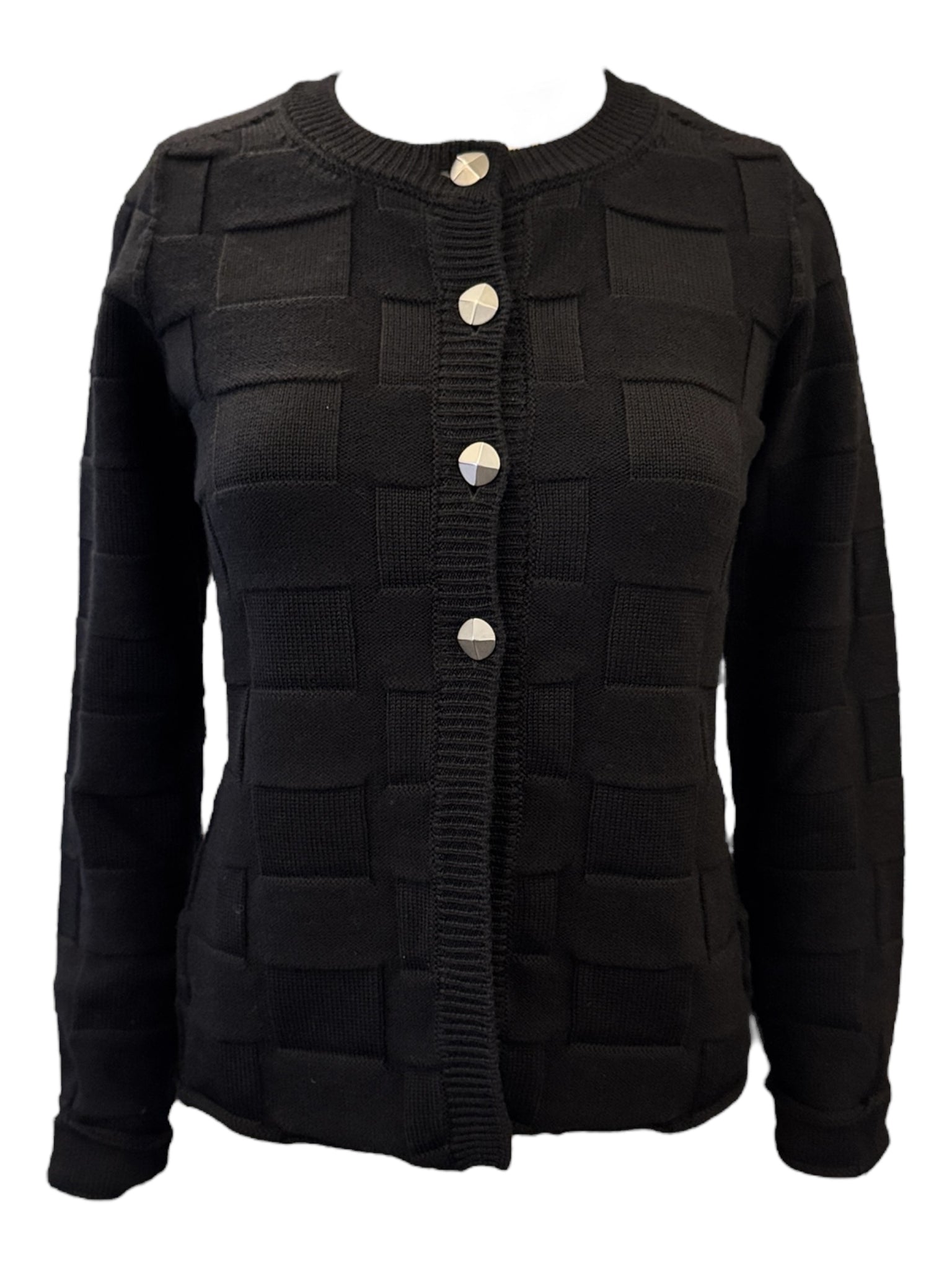 High button cardigan is so stylish in this wide basket weave stitch detail. The buttons are a polished carbon grey geometric style and the cardigan is fitted and the wool is extra fine lambswool.