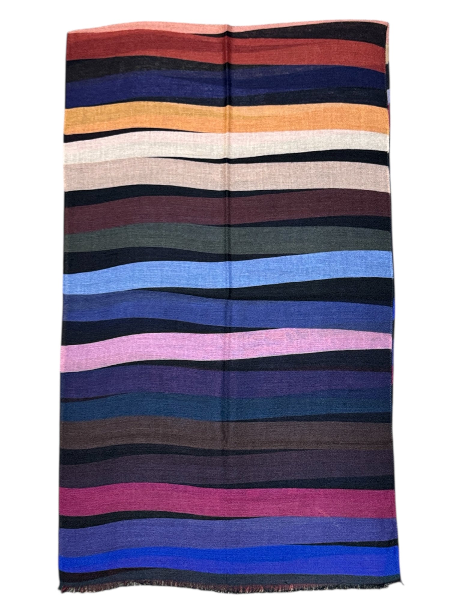 Long lightweight rectangular scarves made from 100% virgin wool are printed in bold random stripes in various colors.
