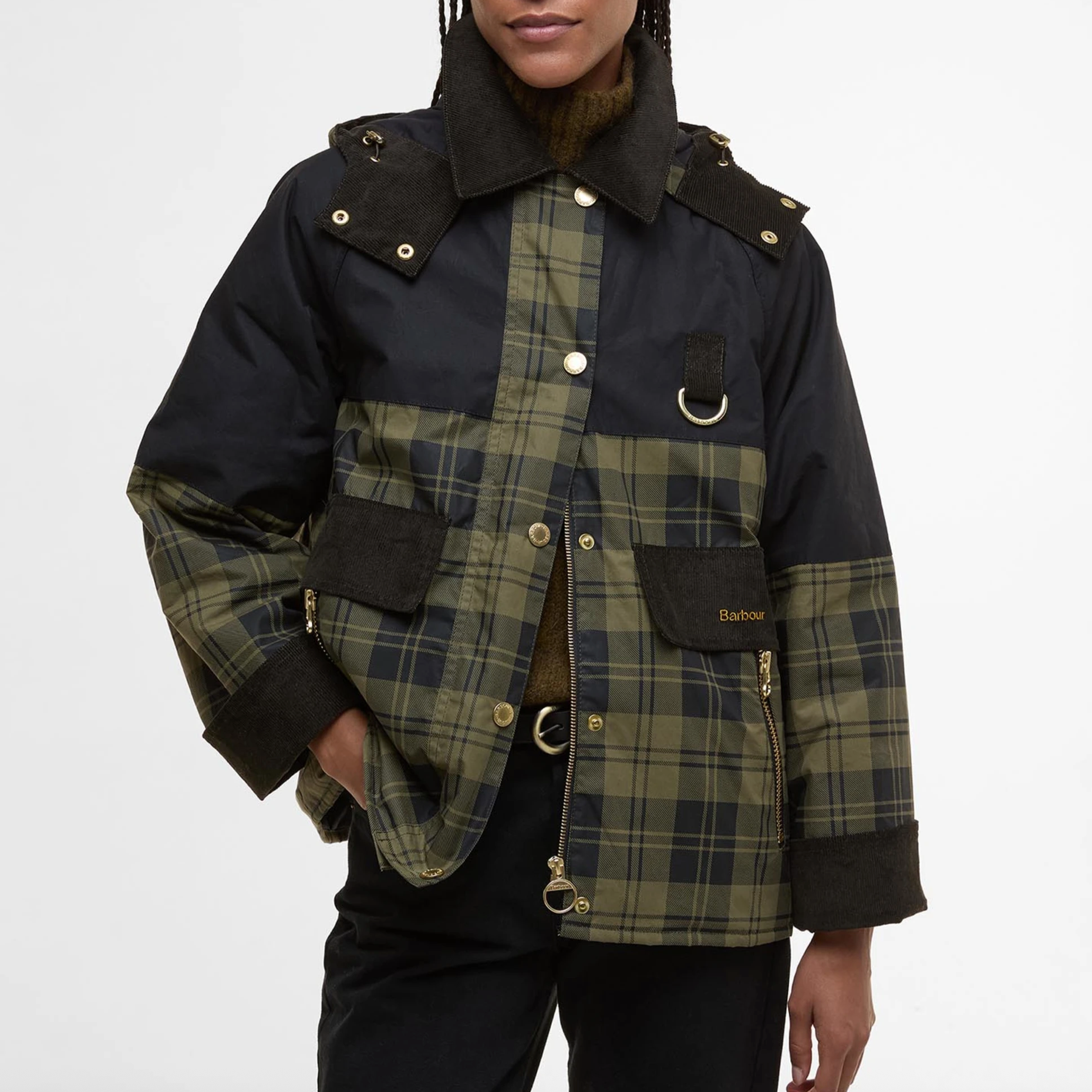 Inspired by our iconic Spey jacket, the Barbour Elaine Showerproof Jacket has you covered. Featuring a patchwork of tartan, cord and plain panels paired with a lightly insulated snorkel hood, handwarmer pockets and cord trims for a classic Barbour look.