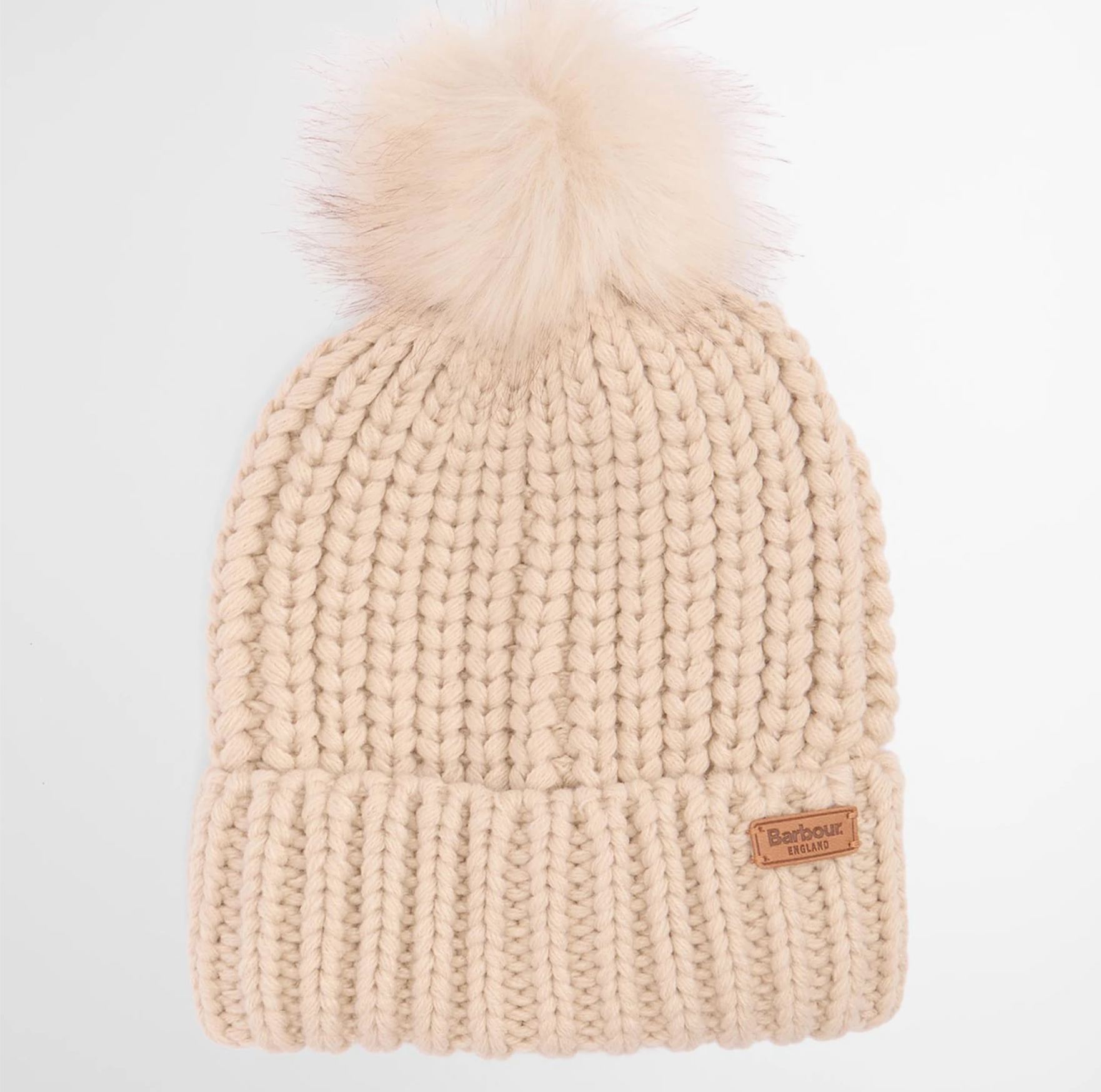 The Barbour Saltburn Beanie is a chunky-knit style featuring a ribbed structure and a turnback hem. A tonal faux-fur pom-pom and a logo-embossed leather badge add contemporary finishing touches.