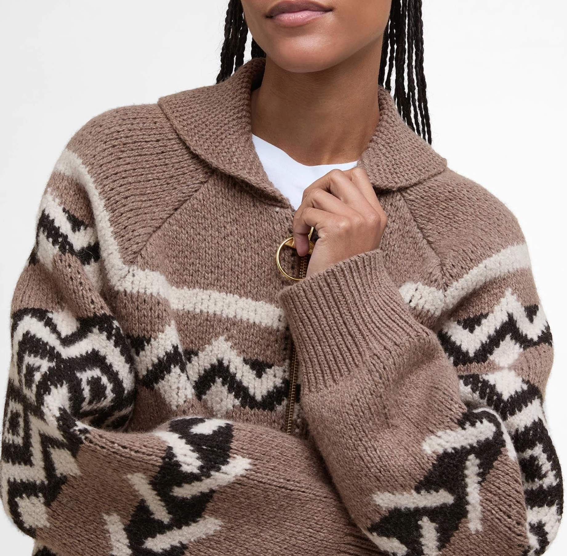 Wrap up in the warmth of the Barbour Klara Fair-Isle Cardigan. With its cosy jacquard knit, playful graphic pattern and just a touch of boucle, this cardigan is perect for the transitional months. Pop your hands in the roomy patch pockets, zip up the shawl collar and you’re ready for whatever the day throws at you.