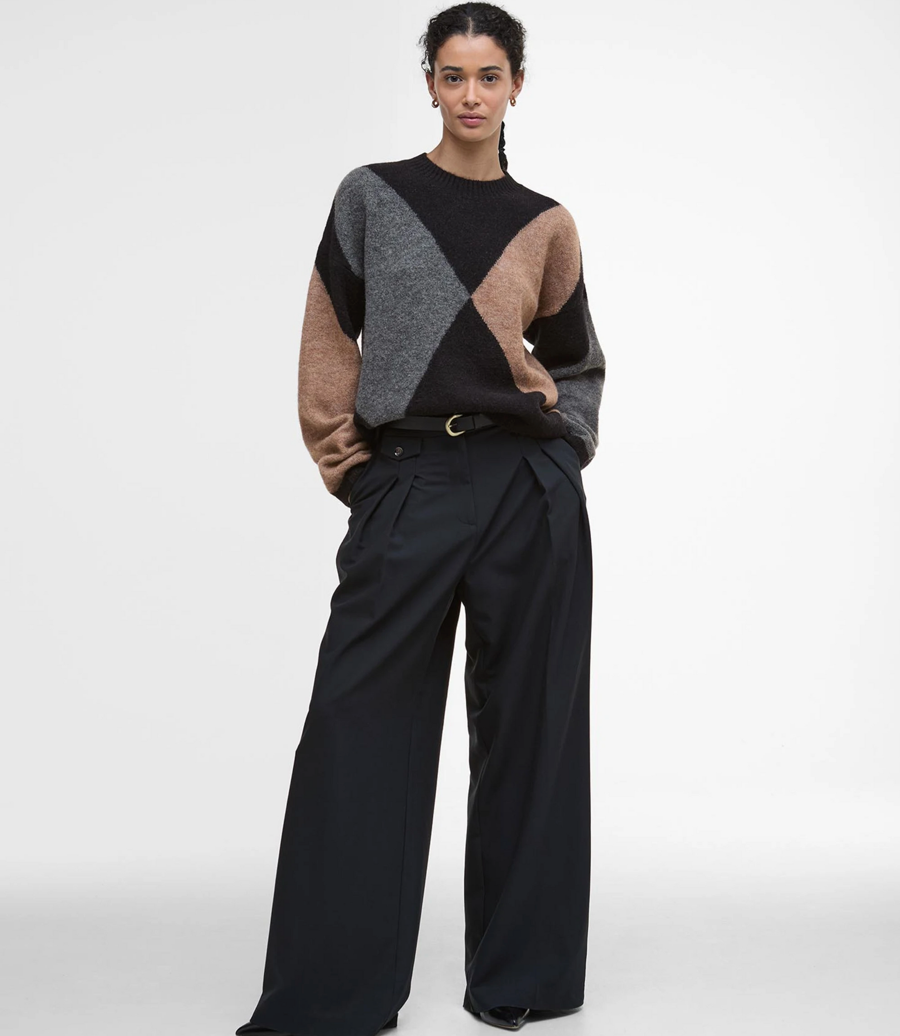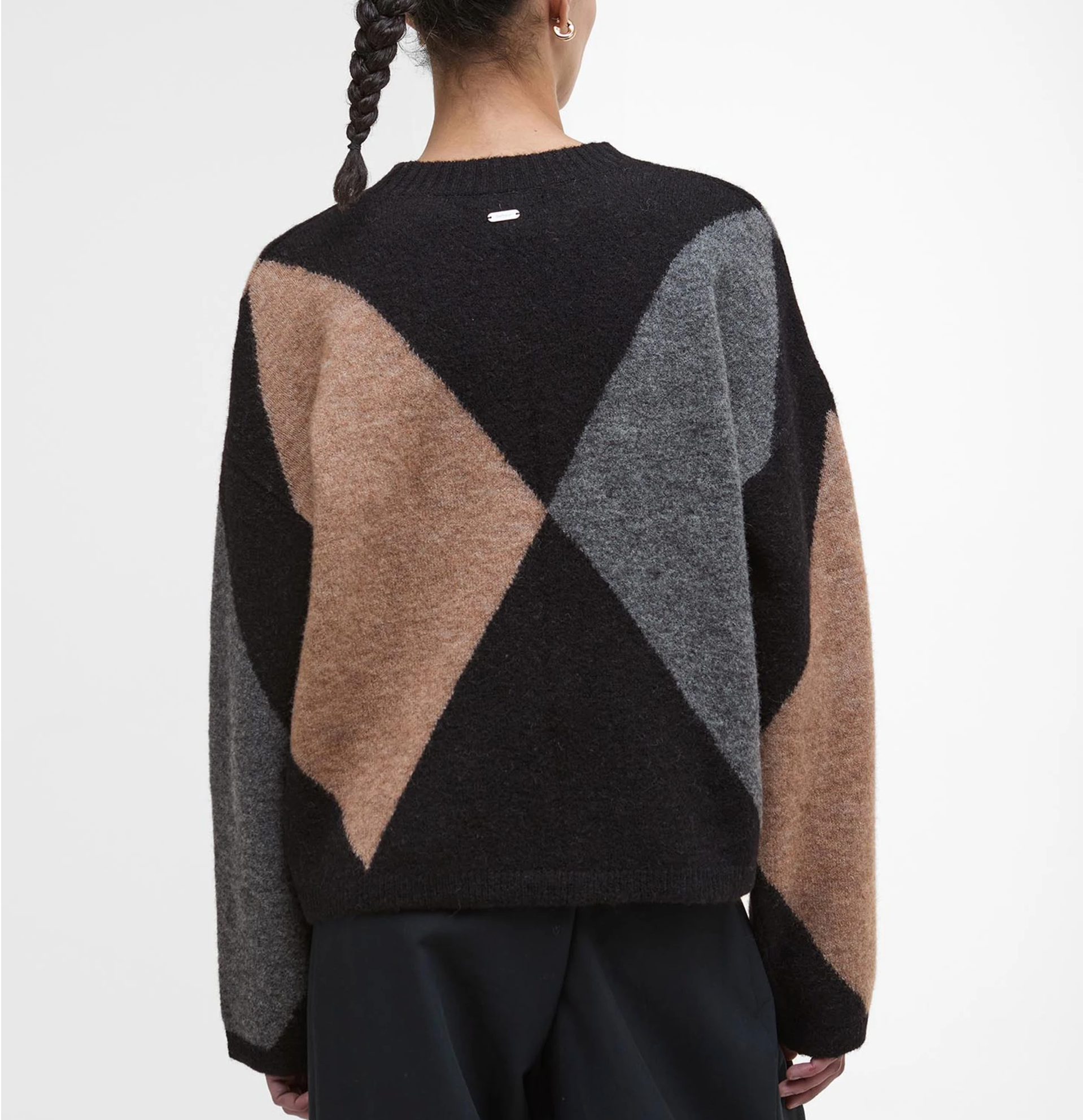 Make a statement in style with the Barbour Sabrina Crew Neck Jumper. Crafted from a premium wool-rich blend, this bold tri-colour jumper features a jumbo diamond design all in neutral colourways making it an effortless styling option in the cooler months.