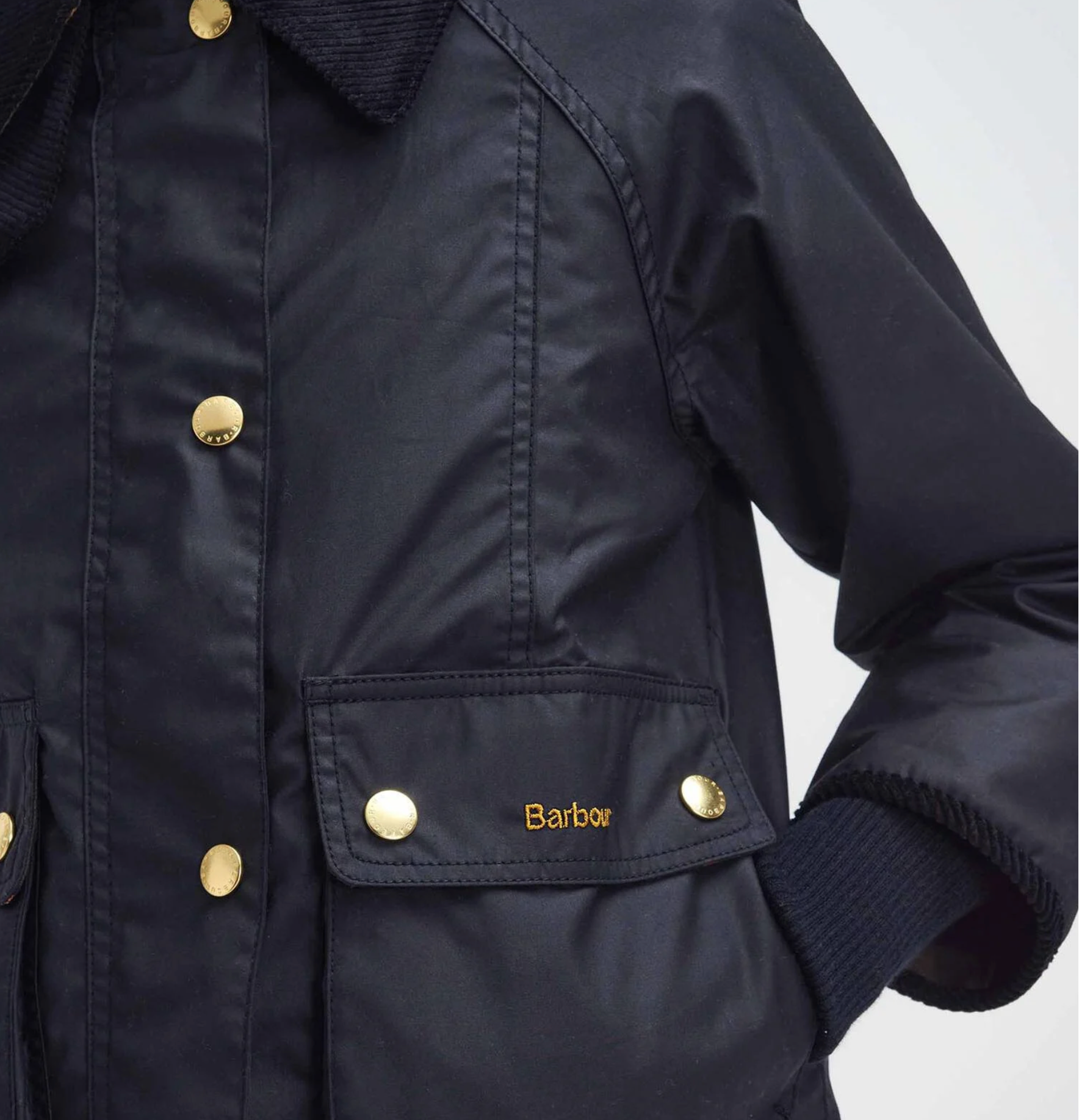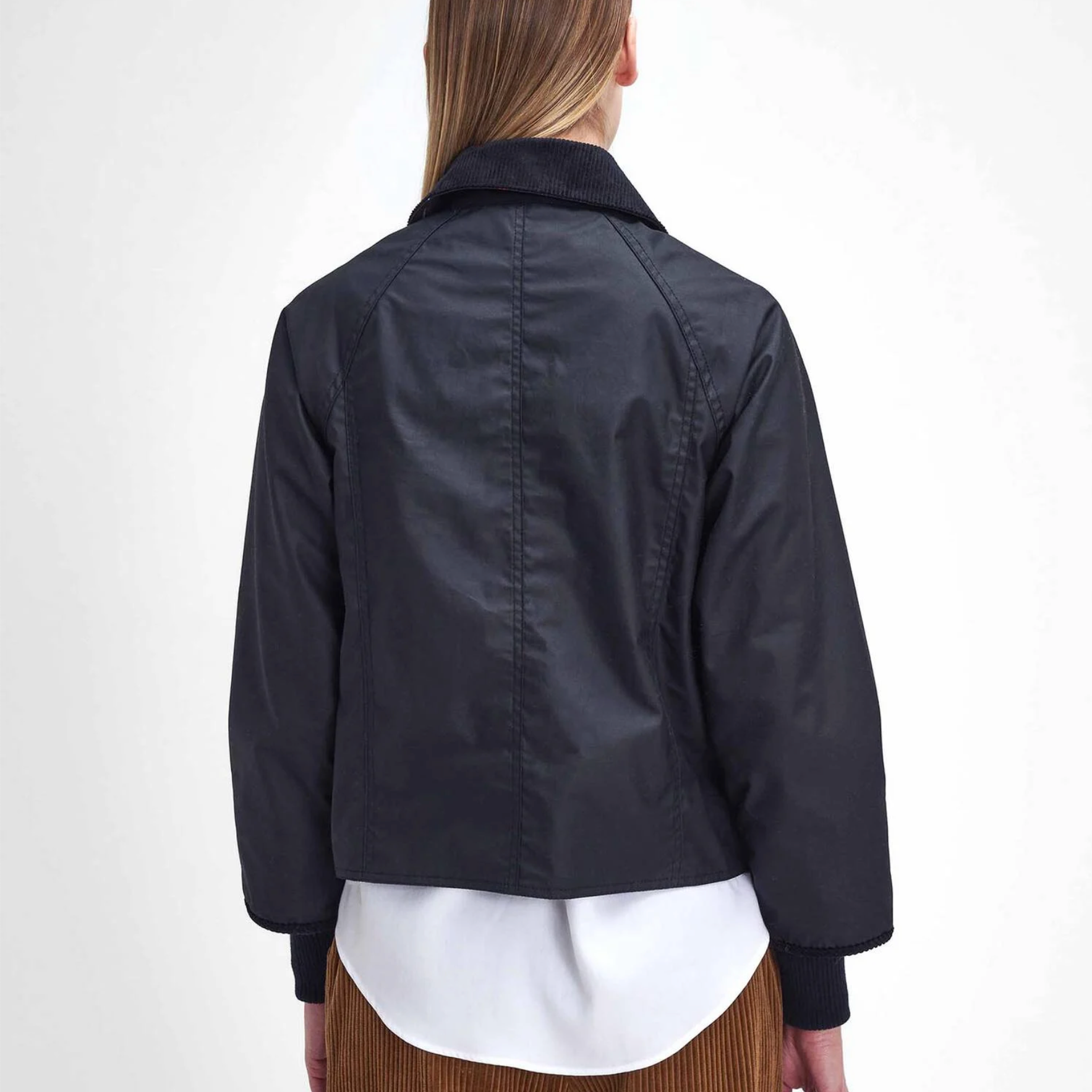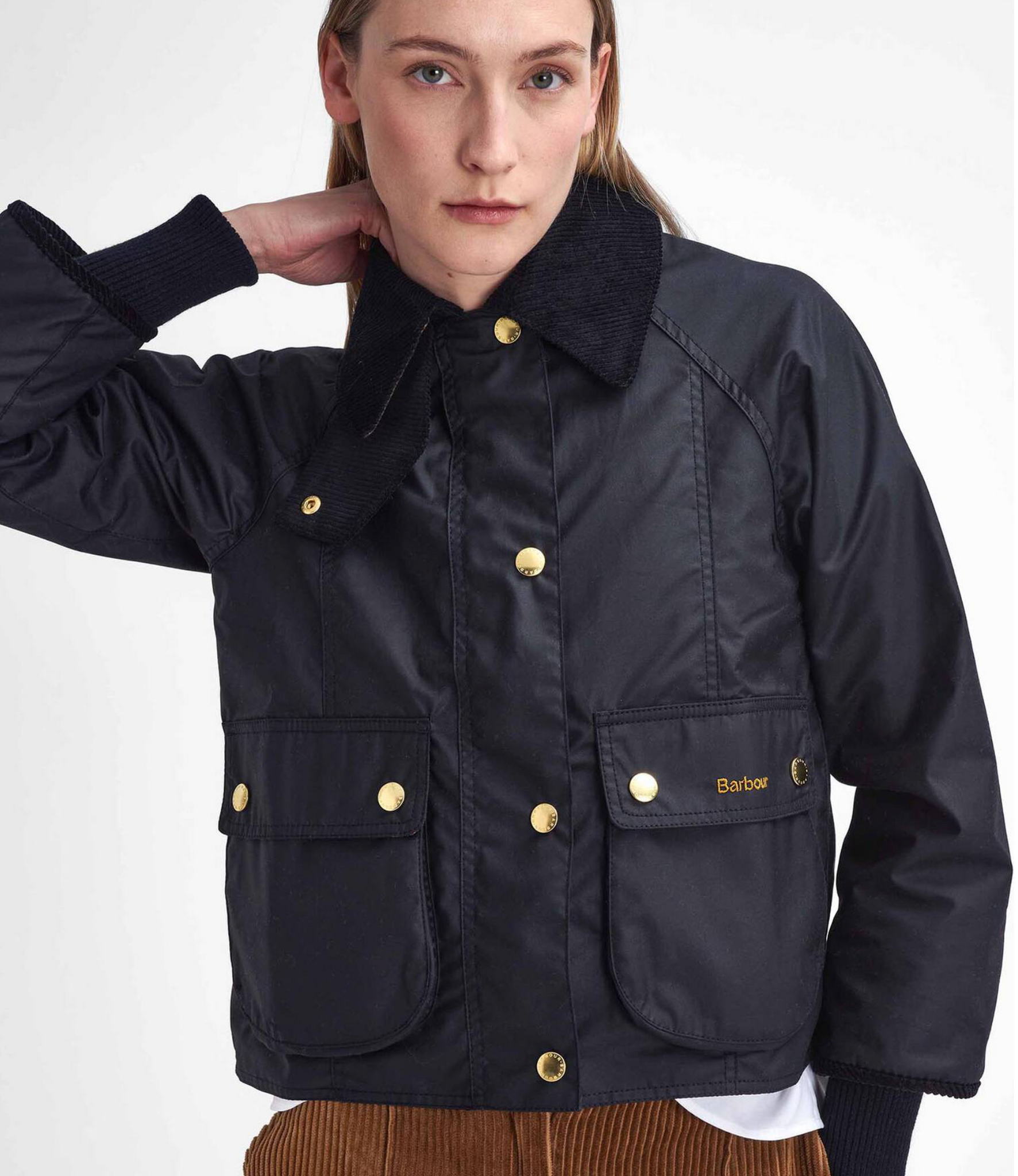 The Beadnell waxed jacket has been a part of Barbour's signature waxed jacket selection since 2010, offering a feminine, tailored rendition of the best-selling men's Bedale waxed jacket to the collection. This season, the Beadnell takes on a modern new look as the Barbour Cropped Beadnell Waxed Jacket displays oversized details featured on the original style. With large, gold-tone, branded snap buttons and the traditional saddle pockets, this style is complete with a cord collar and exaggerated elasticated cuffs for a contemporary touch.