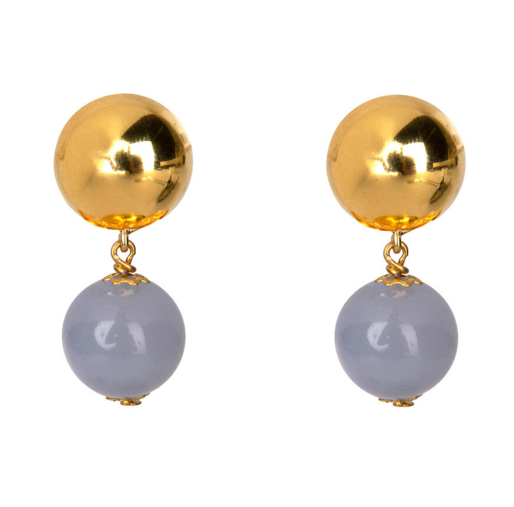 Beautiful drop earrings with a gold plated half dome post with a single large chalcedony bead in soft gray/blue. Beautiful when worn with the necklace with graduating soft blue Chalcedony smooth beads and small gold spacers. Great necklace to add a blue accent, or pick up on light blue in a patterned fabric. Simple elegance that will turn heads.