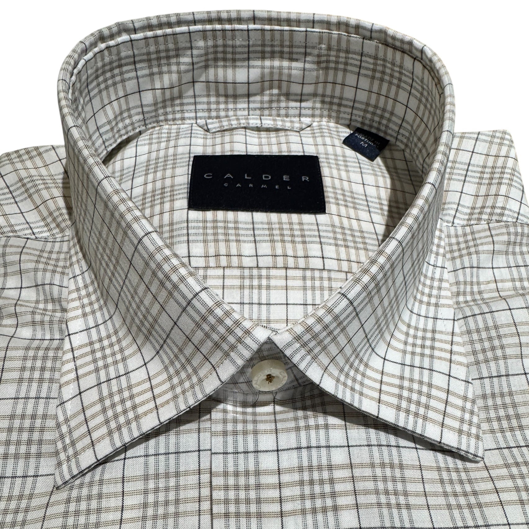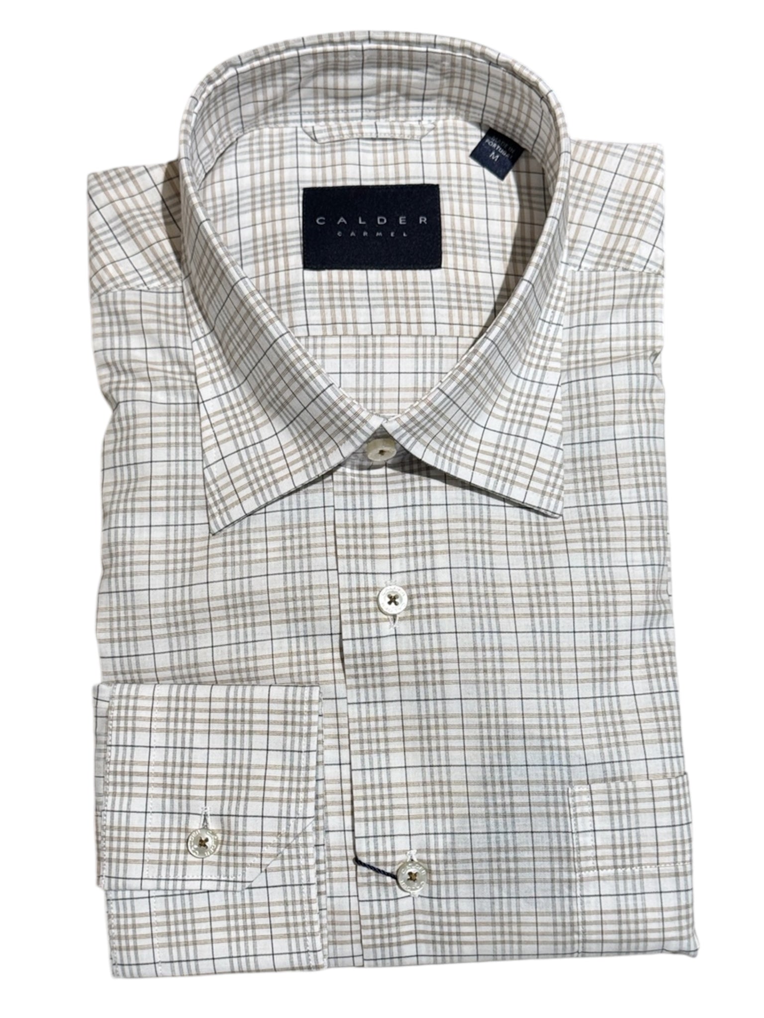 Calder shirts are perfect for those who appreciate classic style with a modern twist. This sport shirt features a luxury poplin graph check in sand and grey on a beige background. Pearl buttons stitched in brown top off the look. Perfect for the man who appreciates understated luxury and timeless appeal.
