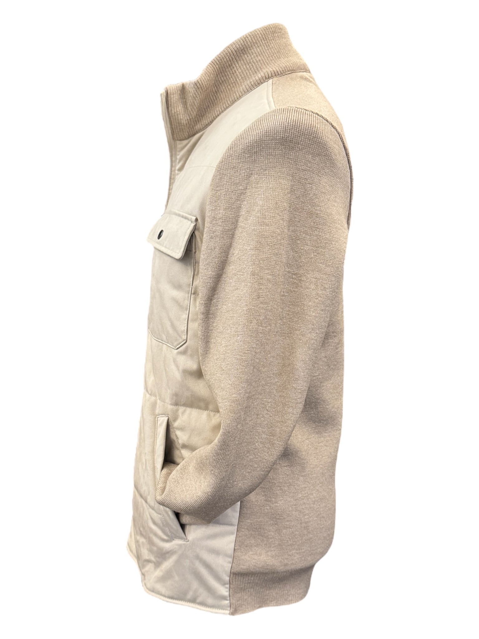 Faux suede body in Ivory with knit sleeves, collar and back in beige