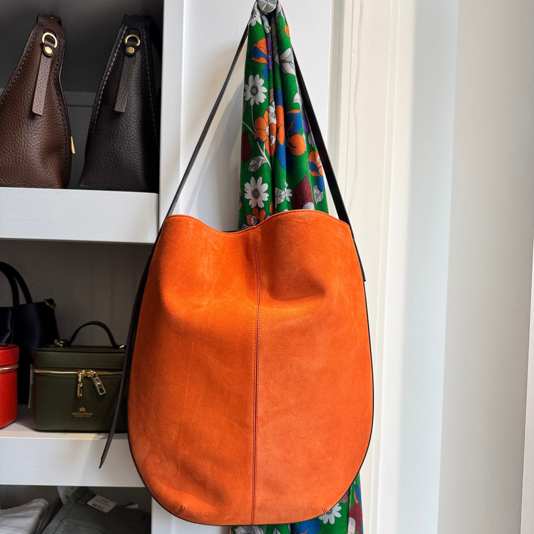 On trend long shoulder bag with adjustable strap in a supple orange suede. Simple elegance with a magnetic closure and inside zip compartment on one side and a slot compartment on the other side.