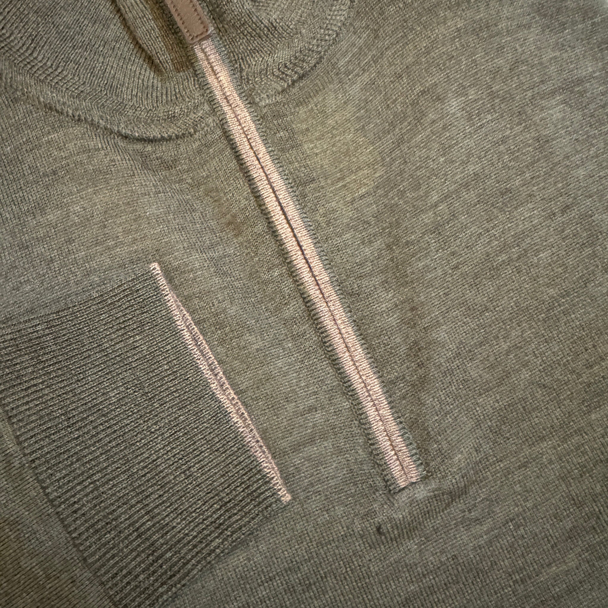 A fine merino wool 1/4 zip sweater is an essential element for the well dressed man in spring. Worn over a sport shirt dresses up your look, or keep it casual over a solid t-shirt. This quarter zip comes with an accent color along the collar, zipper, cuff and waist hem for added interest. Forest Green with Taupe tipping.