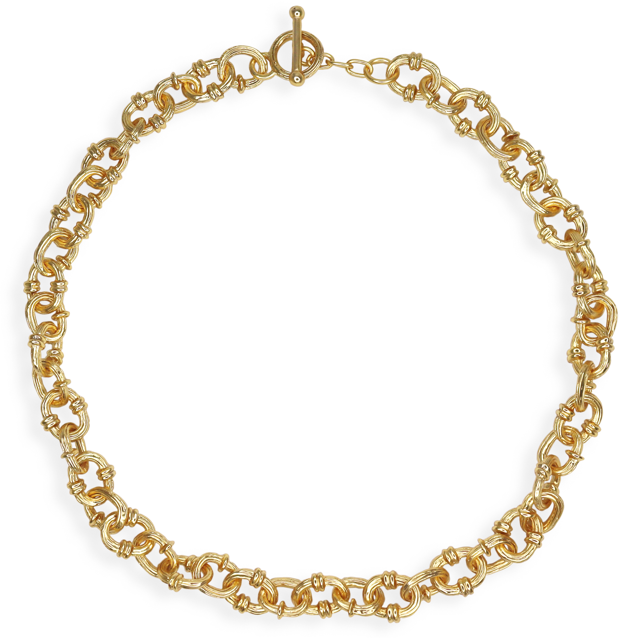 Chunky chain that features a carved design. Perfect chain for layering with other styles! Closes with a toggle clasp. Materials: Pewter alloy plated with 24 kt gold / sterling silver Measurements: 18" long