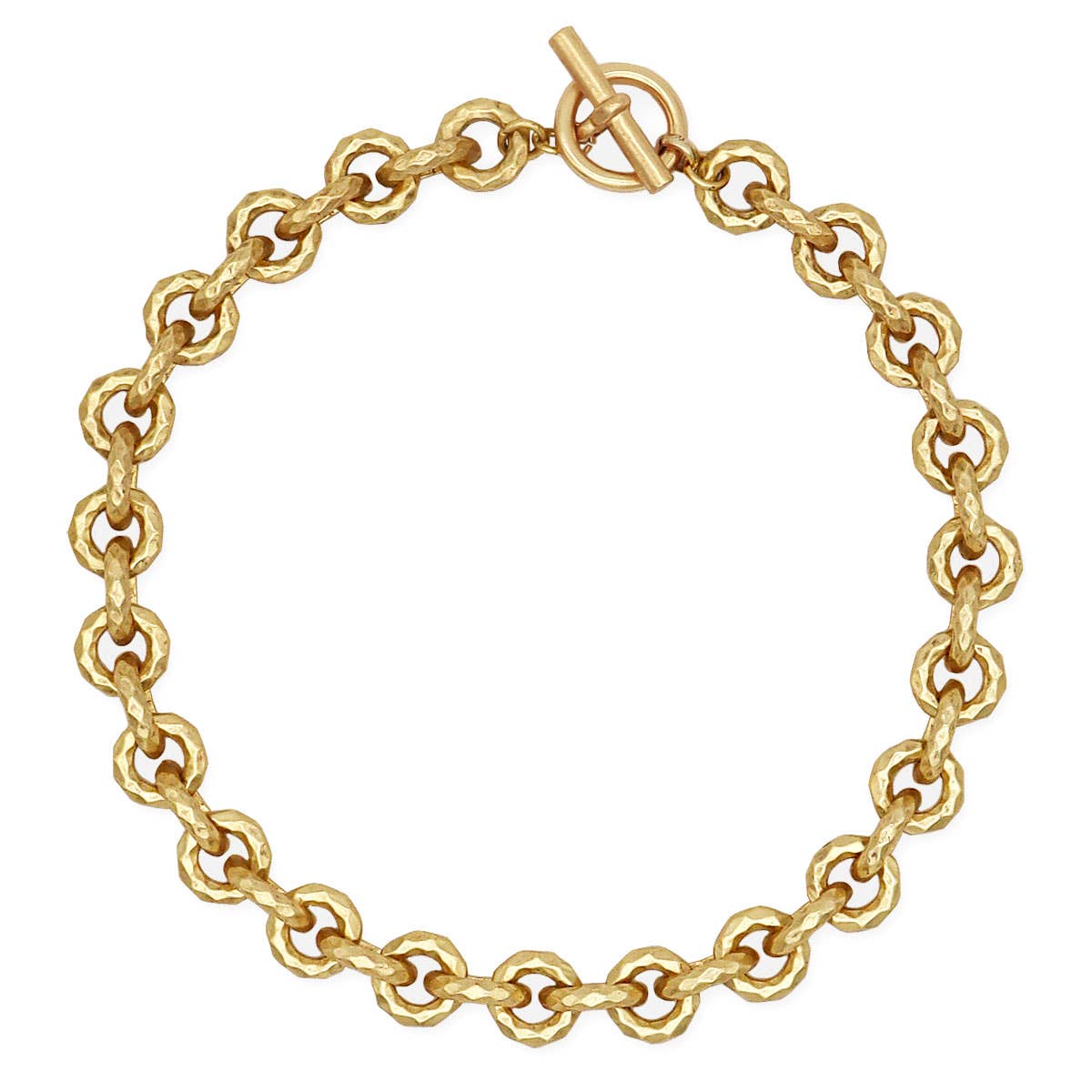 Gilded small round links create this bold and luxurious collar necklace, which is then finished off by an elegant toggle clasp. Wear along, or layered with longer chains we offer for a look that is 100% you.