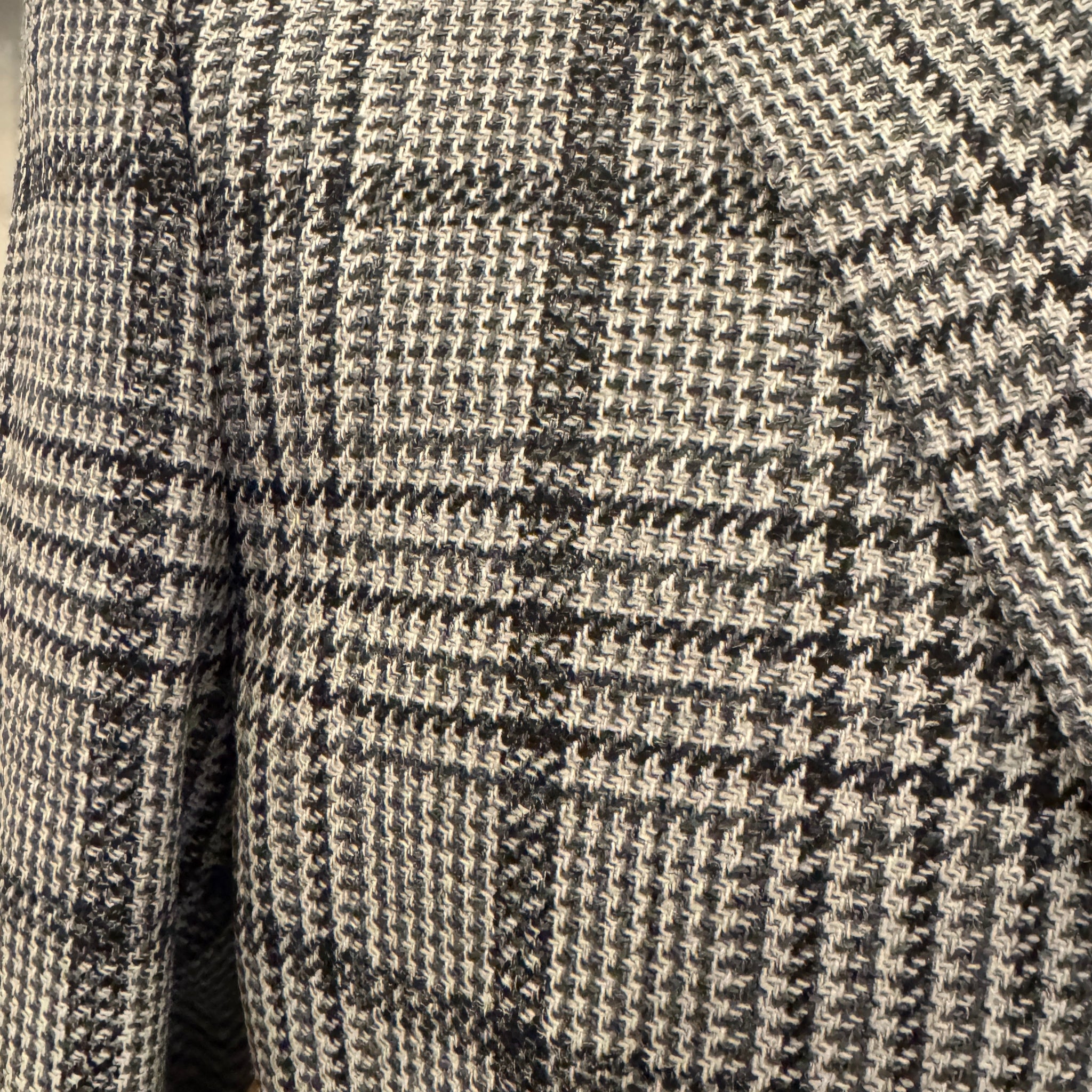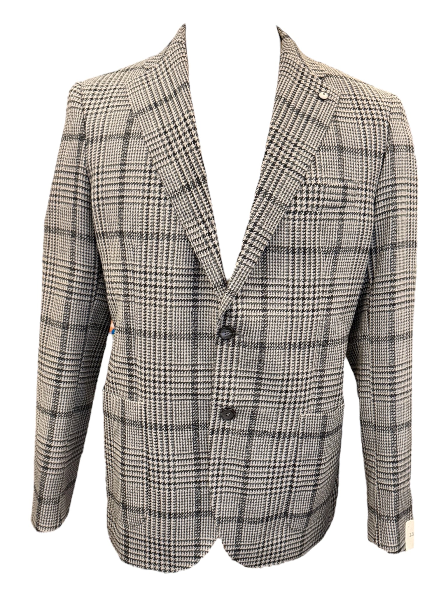 Single-breasted soft wool and silk sport coat in a handsome black and grey houndstooth glen plaid. Contemporary and comfortable and perfect for any occasion. Dress it up with a crisp white shirt and slacks, or wear it casually with a sport shirt and jeans.