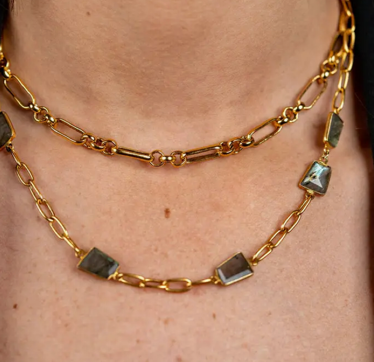 Add a touch of modern elegance to your jewelry collection with this gold chain necklace featuring asymmetrical labradorite accents. The sleek gold-plated chain is beautifully complemented by the organic shapes and iridescent hues of labradorite stones, creating a perfect balance of sophistication and natural charm.