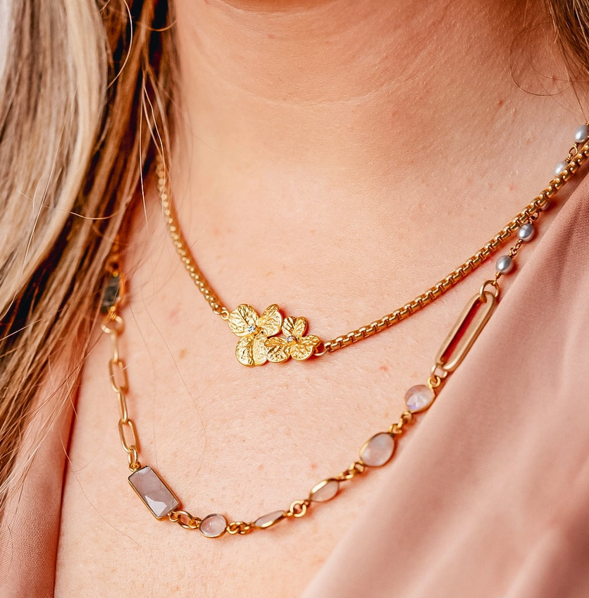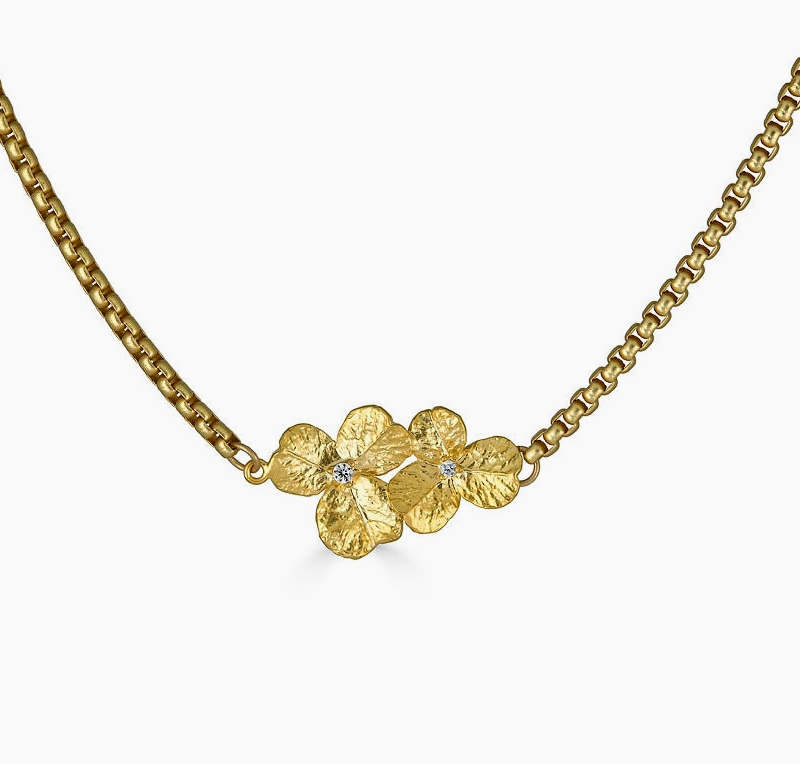 positioned on a sleek gold-plated chain, this necklace is a perfect blend of simplicity and natural elegance. The fine details of the clovers add a subtle sophistication, making it a timeless accessory for any occasion. Lightweight and versatile, this necklace is perfect for layering or wearing as a standalone piece, effortlessly enhancing both casual and formal looks. A charming piece inspired by nature's beauty.