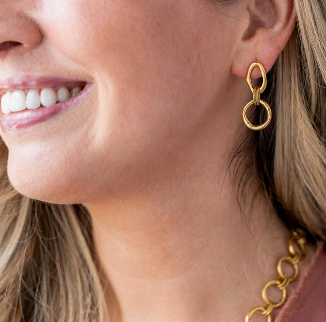 These drop earrings feature two linked sculpted circles in a matte gold finish — organic in form, artful in feel. A textured rope detail wraps the center, adding just enough contrast and a nod to connection. They’re bold without being bulky, perfectly imperfect, and endlessly wearable. These earrings celebrate the beauty of asymmetry and modern simplicity — designed to be worn on repeat.