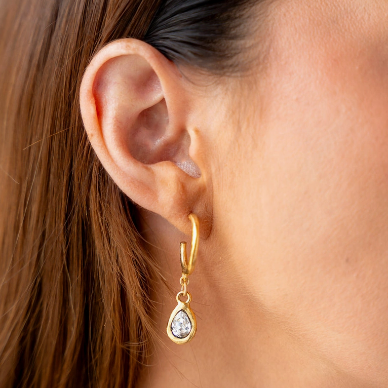 These hoop earrings feature a matte gold finish and a pear-shaped crystal charm that catches light with every move. The teardrop is subtly framed in a sculptural bezel, soft-edged and slightly imperfect — a quiet contrast to the clean brilliance of the stone. They’re the kind of piece that feels dressed up or down depending on your mood. Wear them solo, or layer with other hoops for a mixed-texture ear stack.