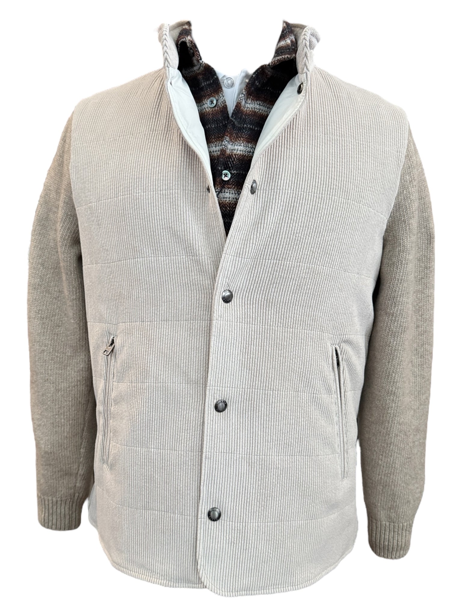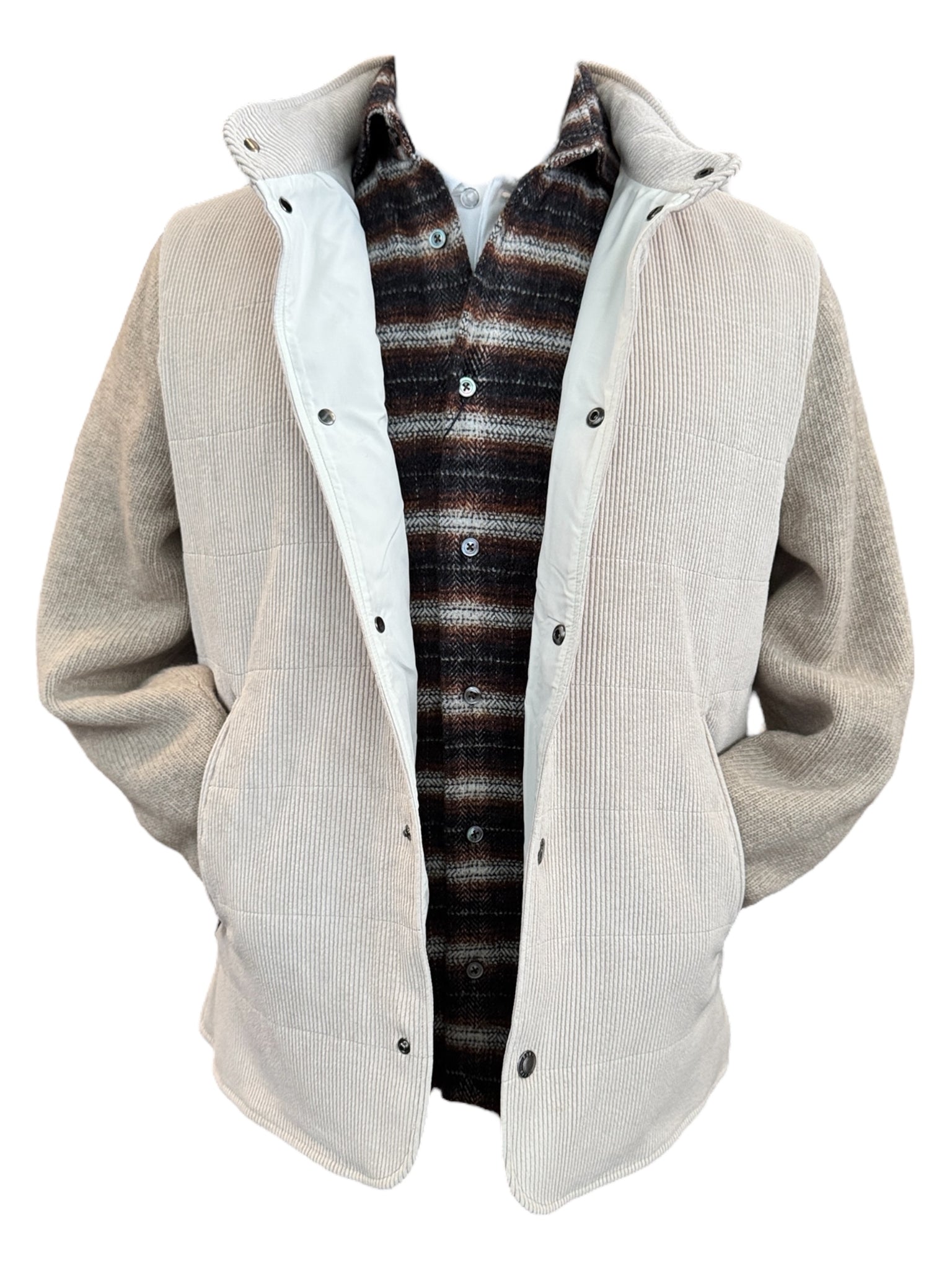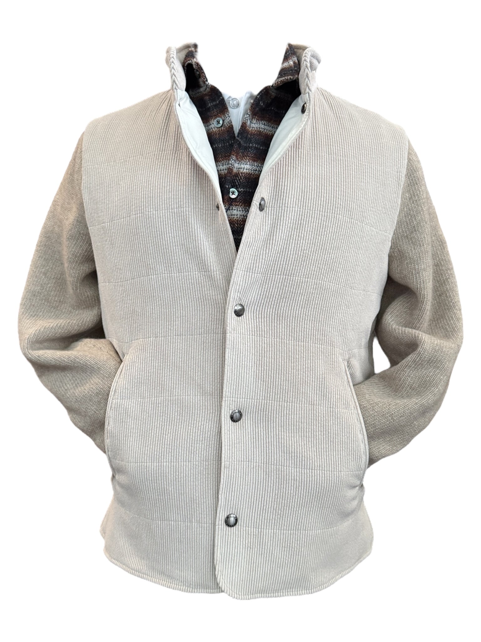 Luxury, warmth and protection from the elements, this soft corduroy and knit hybrid jacket has it all. The ultra soft velvet corduroy in a creamy ivory is paired with the knit sleeves in a wool/cashmere blend. Add the nylon lining inside to keep out the bitter cold, and you have a beautiful outerwear piece that has style and function. Light enough to wear all year round.
