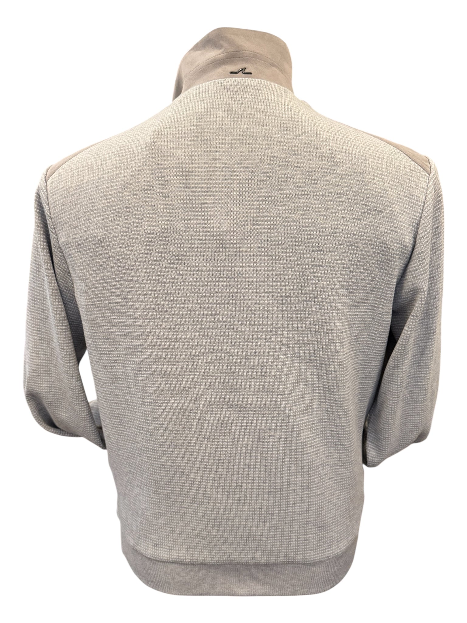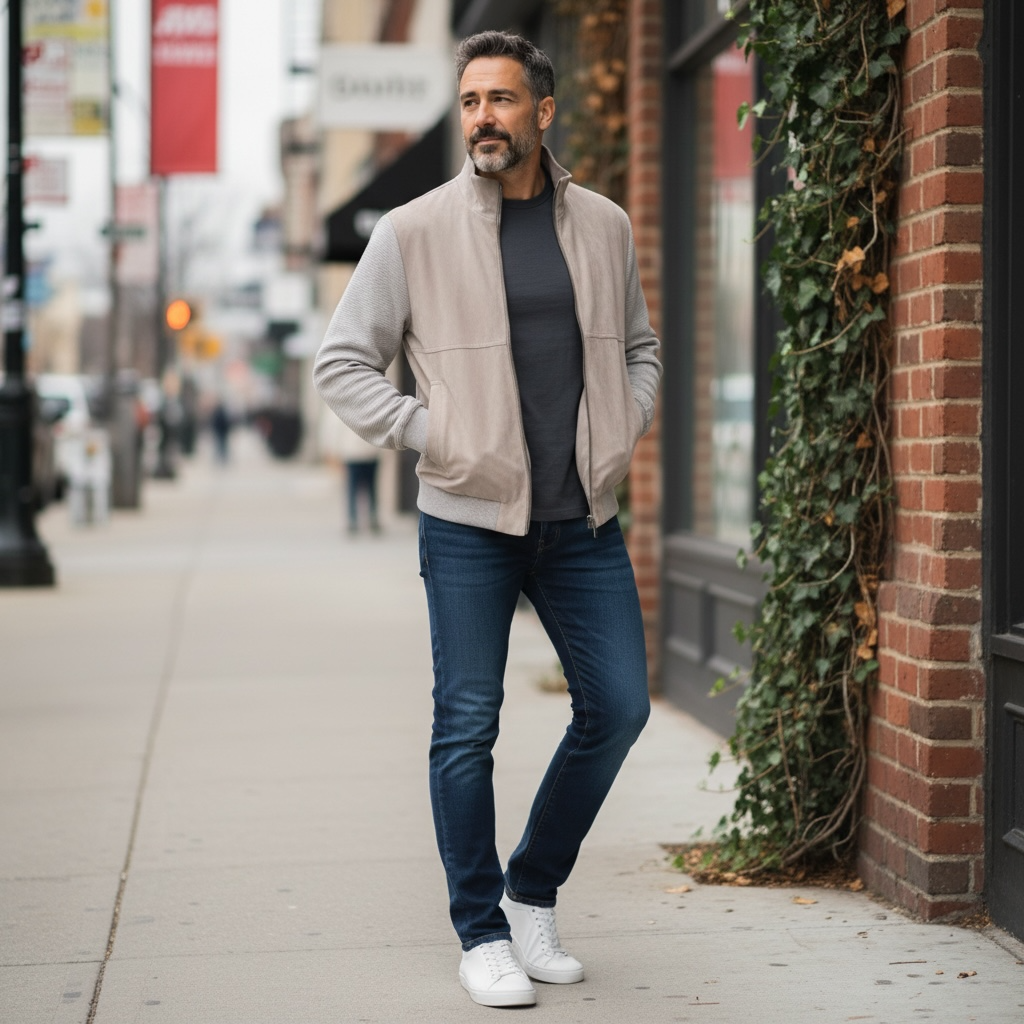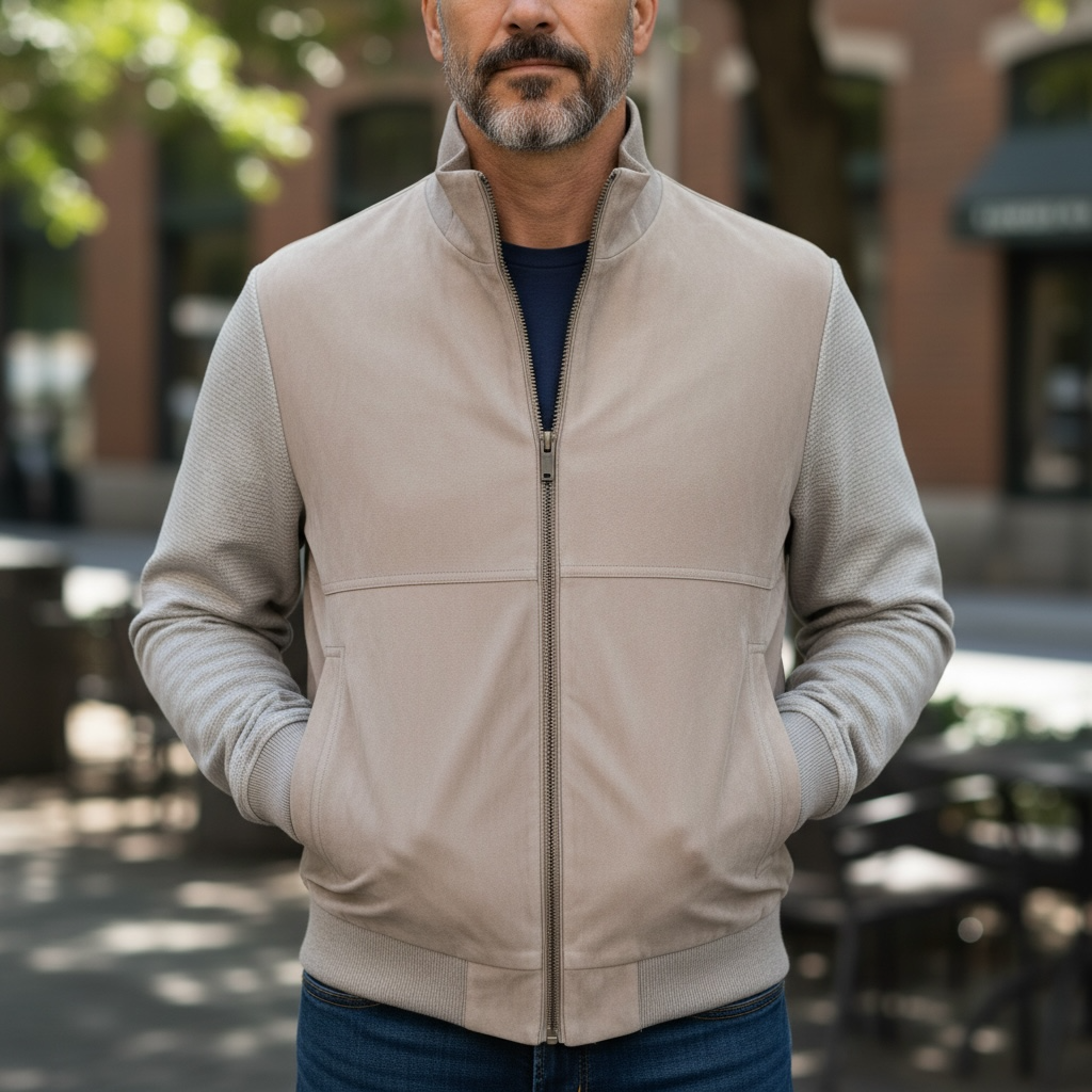 A sophisticated hybrid jacket that seamlessly blends innovation with timeless style. Featuring a textured cotton-silk knit for lightweight comfort and Aqualeather water-repellent suede for durability, this piece delivers both elegance and practical functionality for the modern wardrobe.