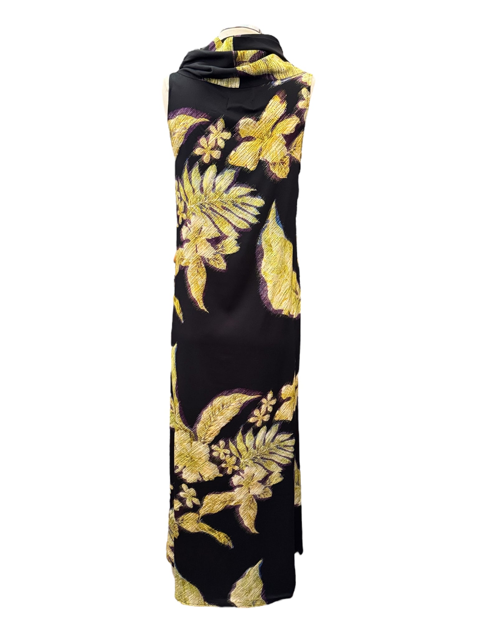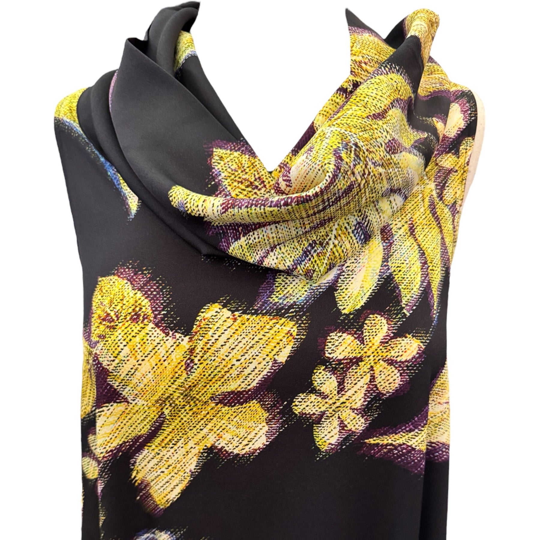 Black sleeveless dress with a golden yellow large floral print is made from a unique silk and elastane blend that creates the perfect combination of sophistication and comfort.