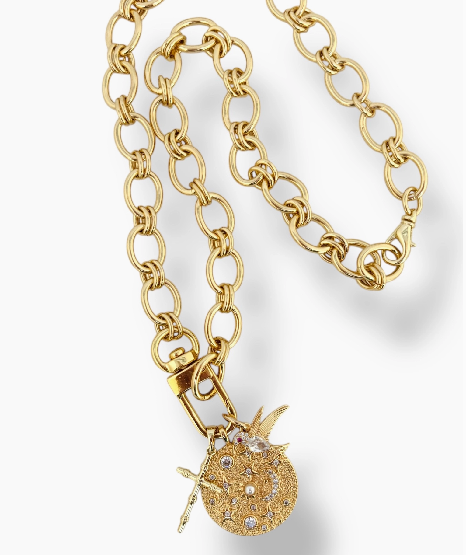 Beautiful thick interlocking gold plated chain necklace can be worn alone or you can add as many charms as your heart desires. Sold here with 3 charms attached.