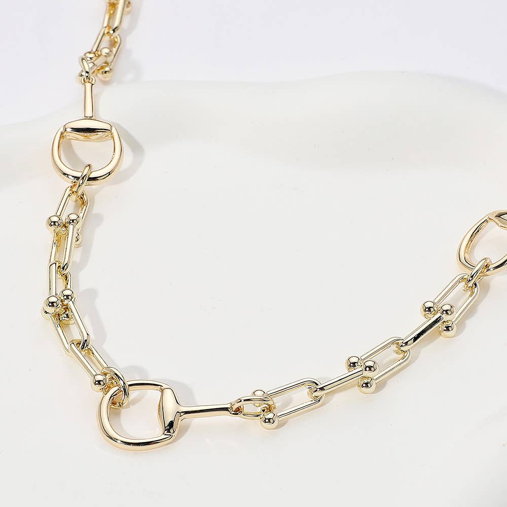 • Necklace Size : 17" + 2" L • Decor Size : 0.6" L • Contemporary necklace featuring unique geometric horsebit links adorned with delicate bead accents. A chic and versatile design that effortlessly complements casual, work, and evening styles for a refined, fashion-forward look. • Gold Dipped