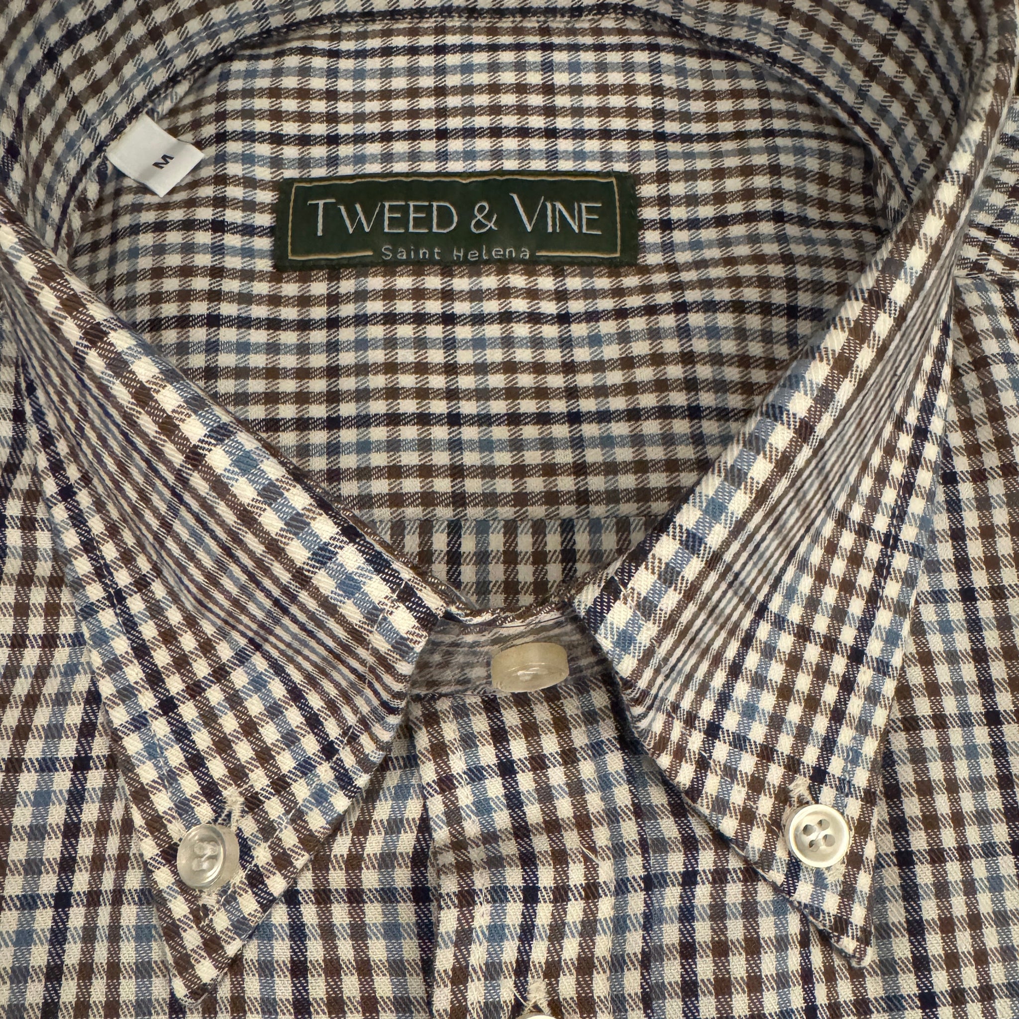 A classic cotton twill button down shirt, with a handsome blue and brown subtle check pattern that is perfect paired with chinos or jeans.