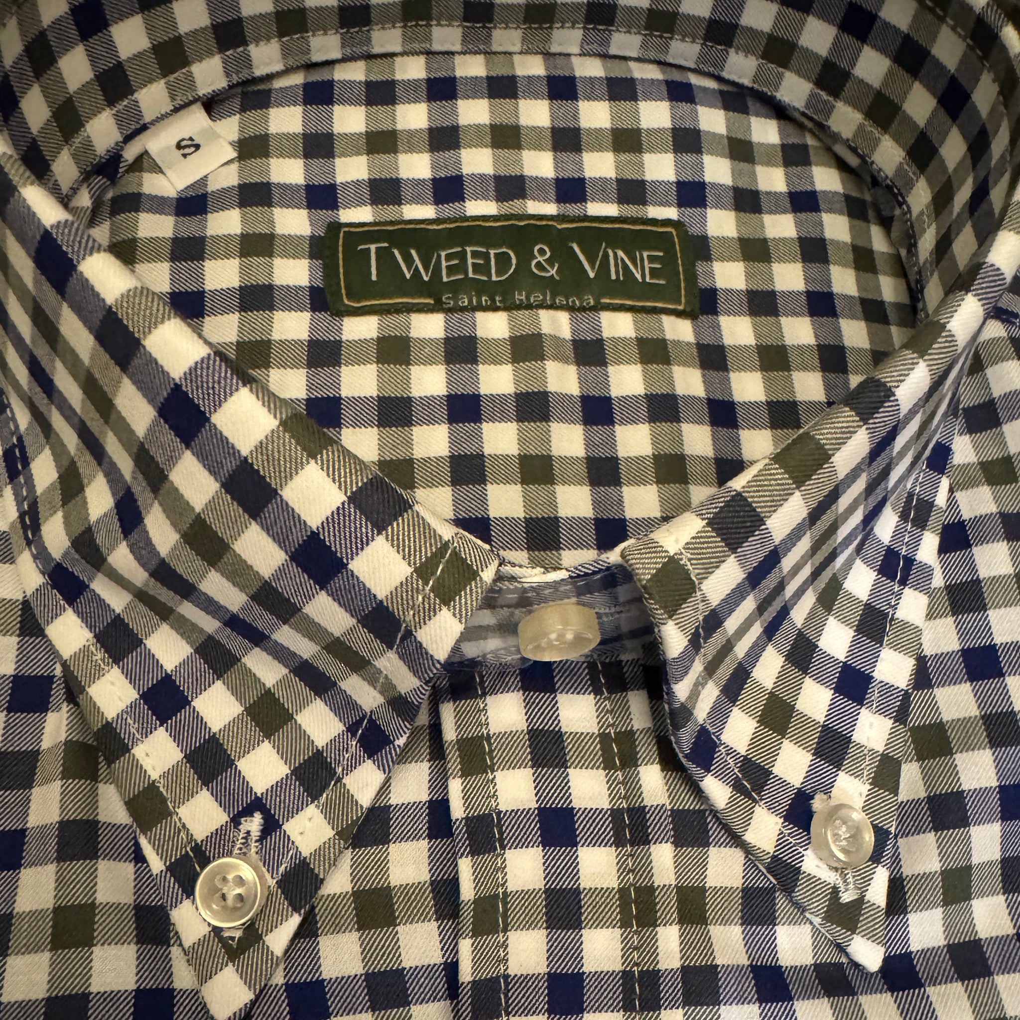A classic cotton twill button down shirt, with a handsome navy blue and dark green gingham check. Great to pair with chinos or jeans.