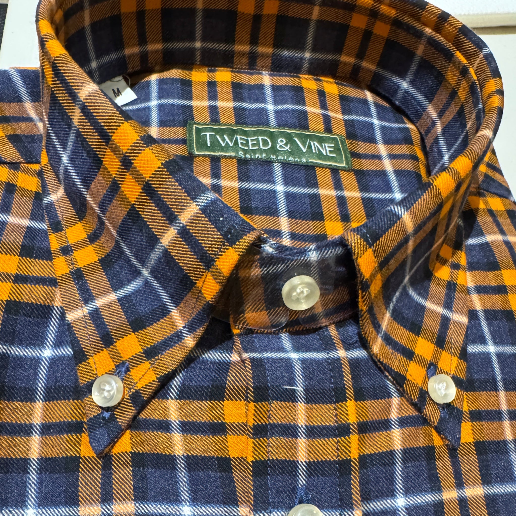 A classic brushed cotton button down shirt, in a bold orange and navy blue plaid pattern. A perfect holiday festive shirt that looks great with your favorite jeans or chinos.