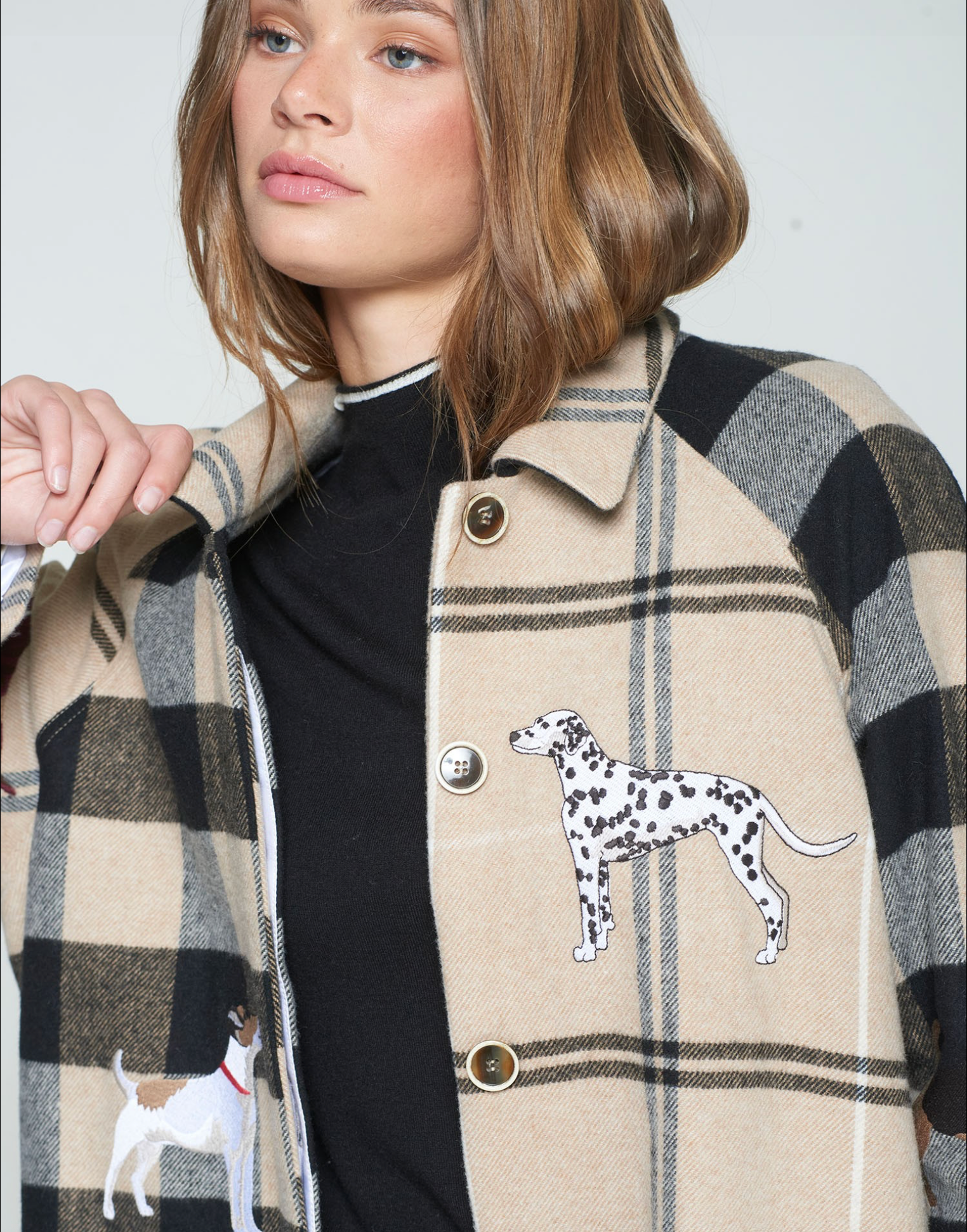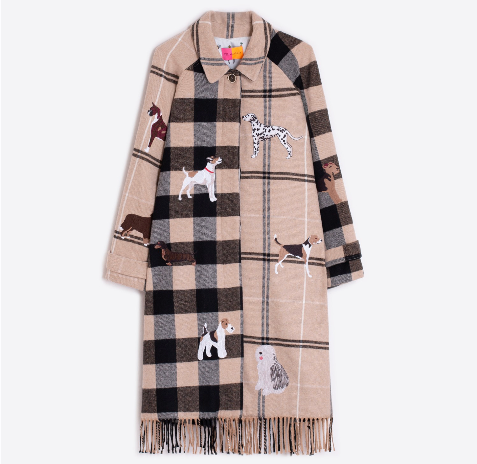 Long coat in a mix of large and small checks in beige and black. Decorated with embroidered dogs on the front and sleeves. Shirt collar and button-down front. Finished with a fringed hem and a printed inner lining. Made from a warm wool blend.