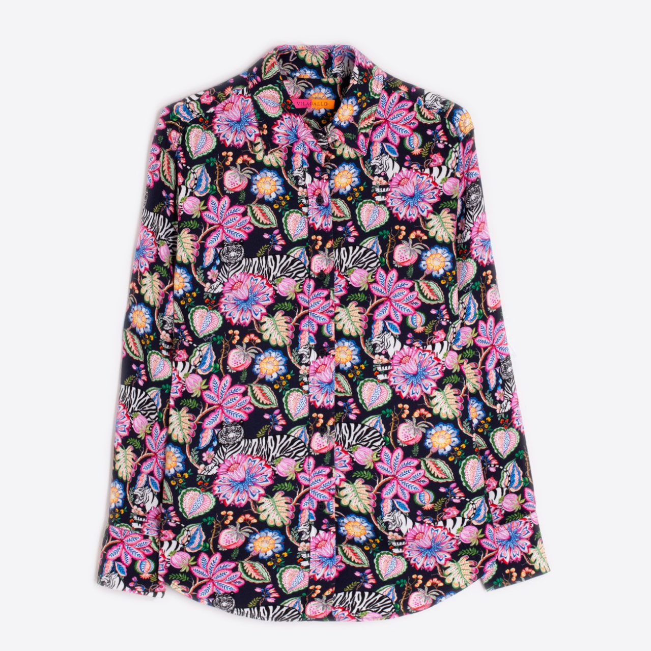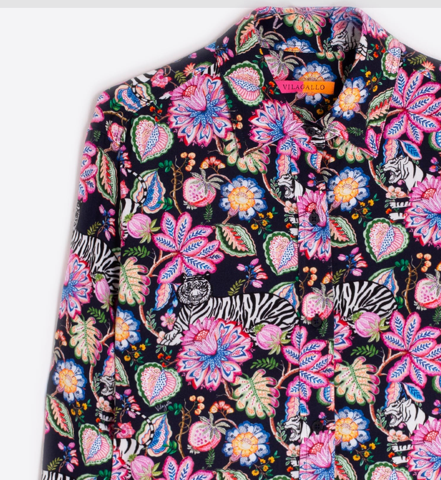 Long-sleeve shirt made of 100% viscose with a colourful floral and tiger print over a navy background. Classic shirt collar, front button fastening and rounded hem. Straight fit.