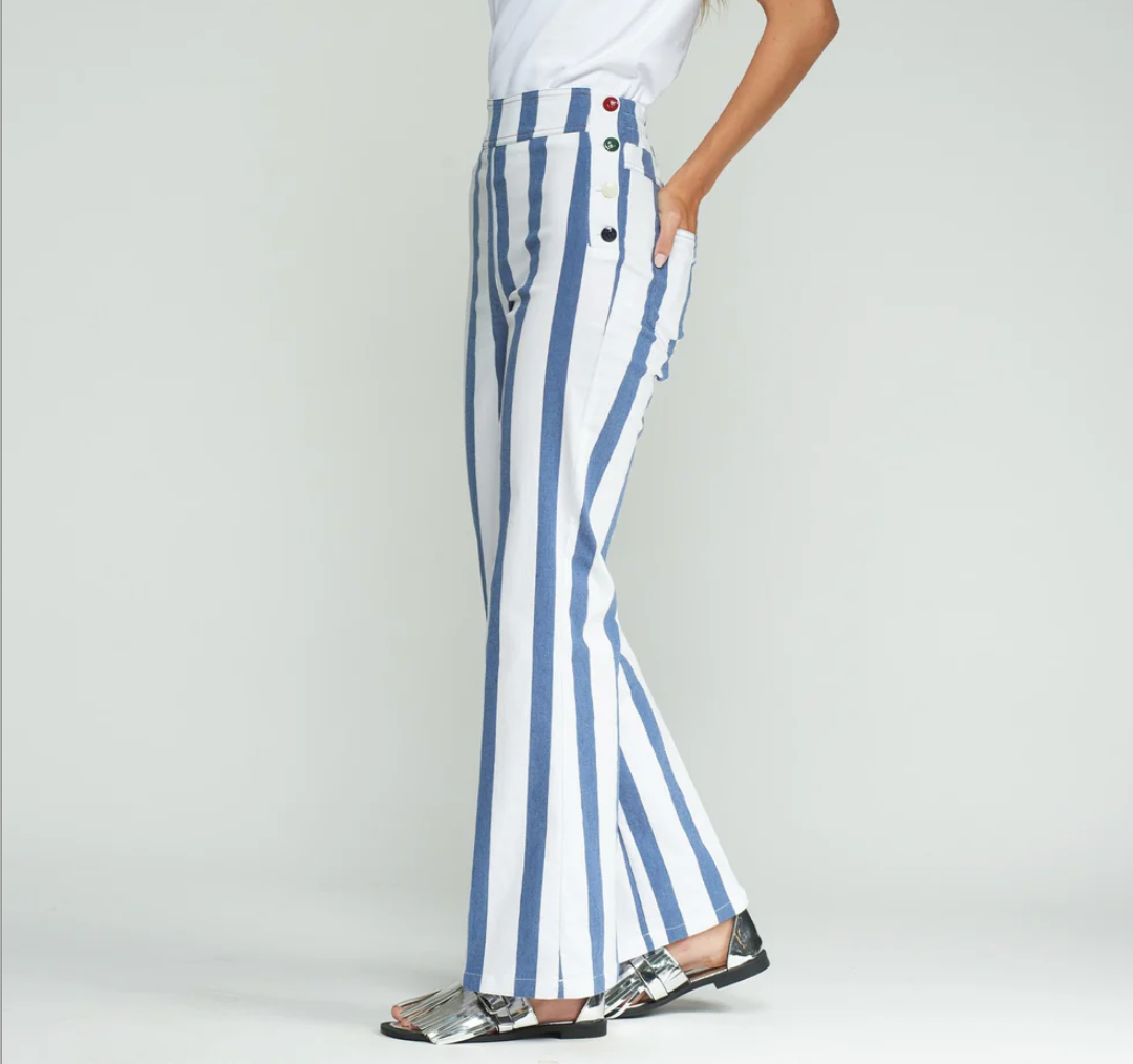 Straight-cut trousers with a vertical striped print in blue and white. Decorative buttons on both sides of the waistband.