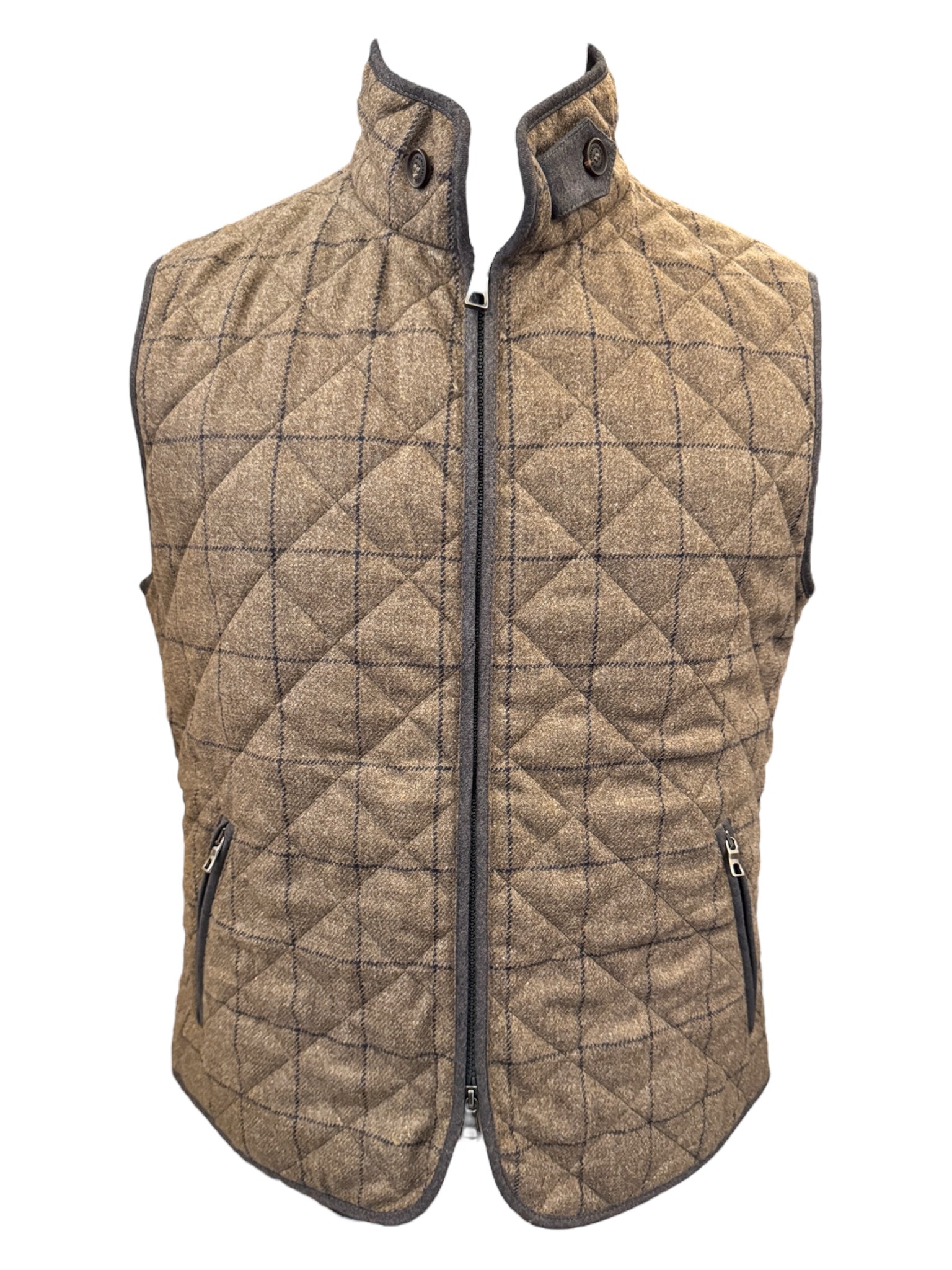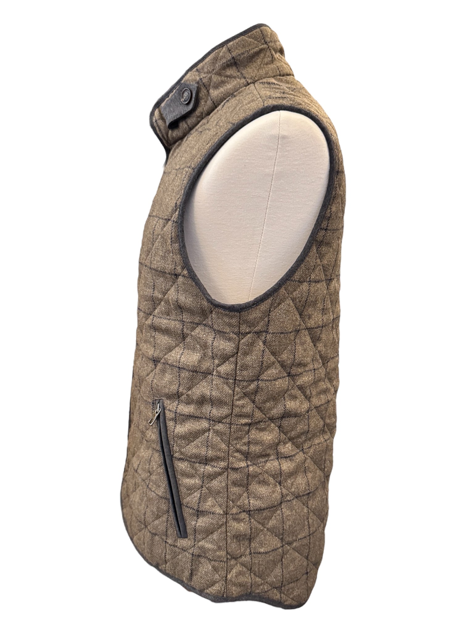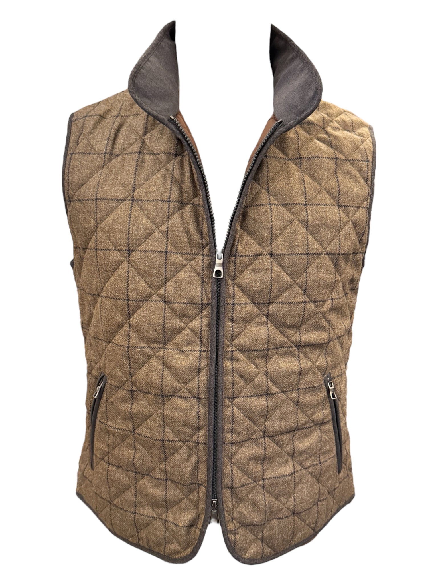 Classic quilted vest with a modern look. This new Theo vest this season is made from a beautiful wool tweed fabric with a windowpane plaid and a diamond quilt pattern. Contrast wool flannel in dark brown top off the look.