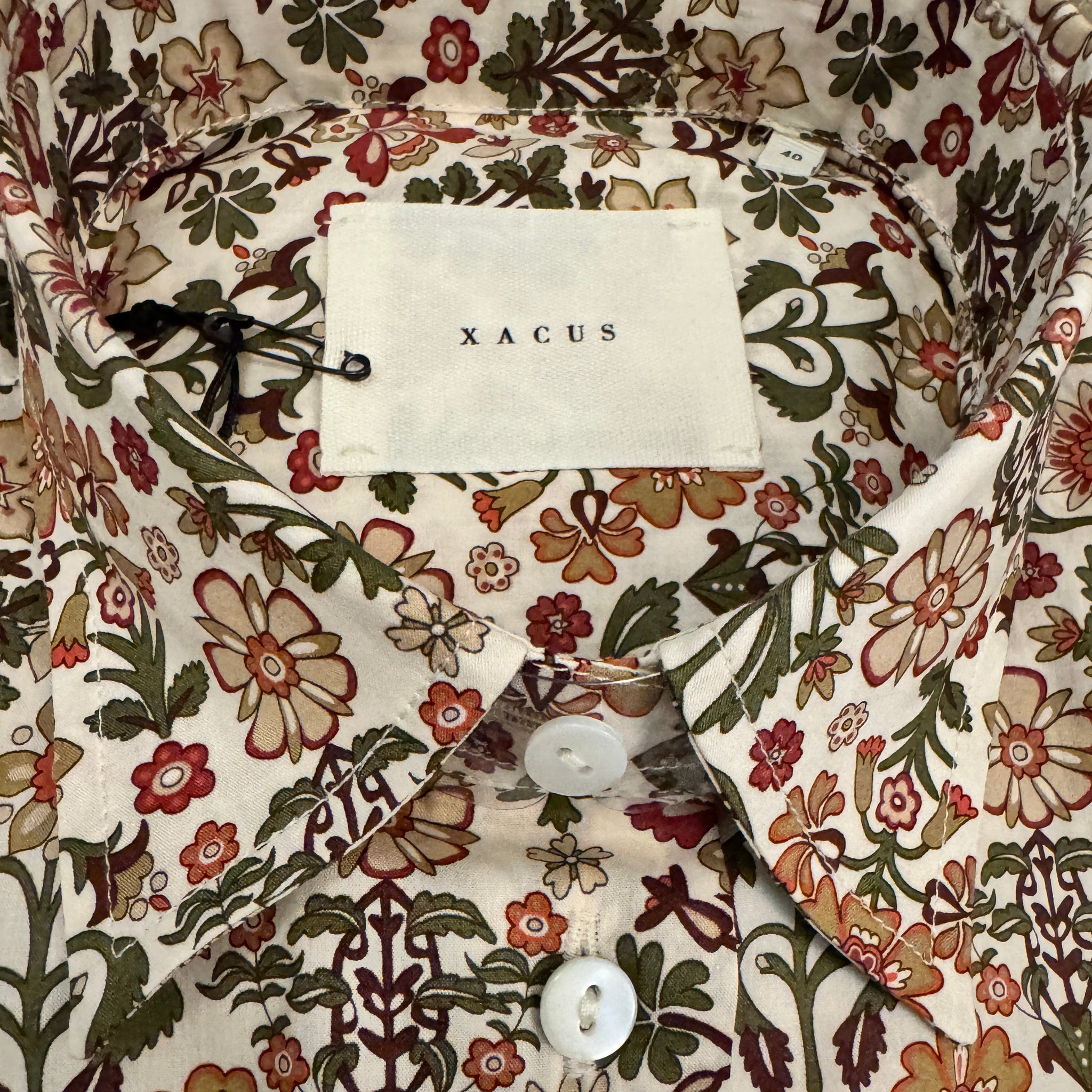 Tailored women's shirt from Xacus, Italy. Point collar, simple and chic with a beautiful liberty print in shades of orange, Olive and green floral. Dress it up with a beautiful sweater or blazer and trousers. Wear with your favorite denim for a more casual look.